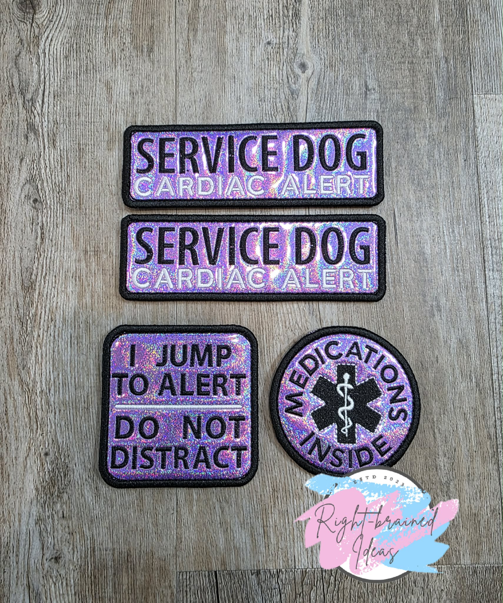 Service Dog Cardiac Alert Black And White On Sparkle Purple Holographic Vinyl Four-piece Patch Set