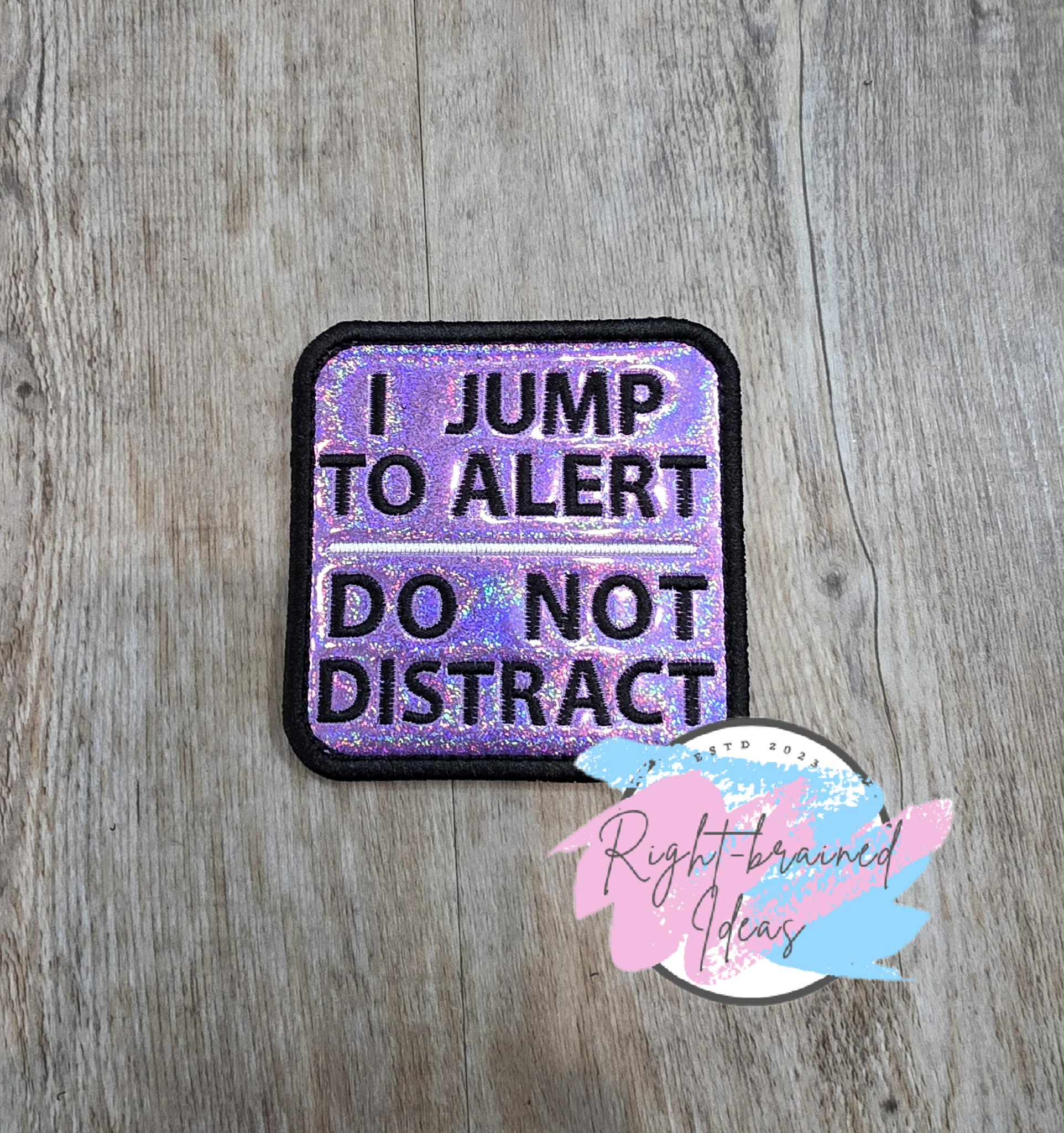 (1) 3.5in x 3in sparkle purple holographic vinyl rectangular patch: "I Jump To Alert" and "Do Not Distract" in black with a white line in between the two statements.