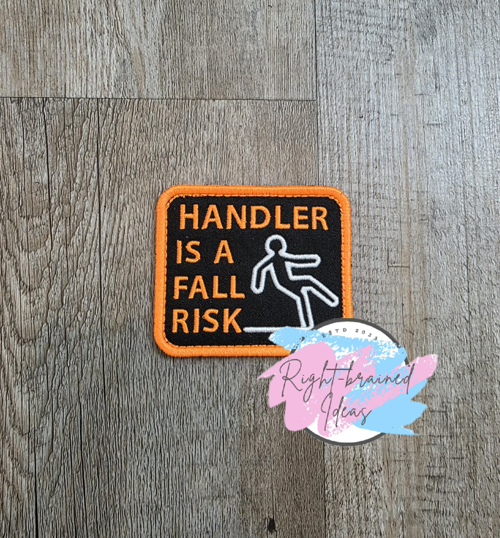(1) 3.5in x 3in black twill rectangular patch: "Handler Is A Fall Risk" in neon orange next to an outline image of a falling human figure in white.