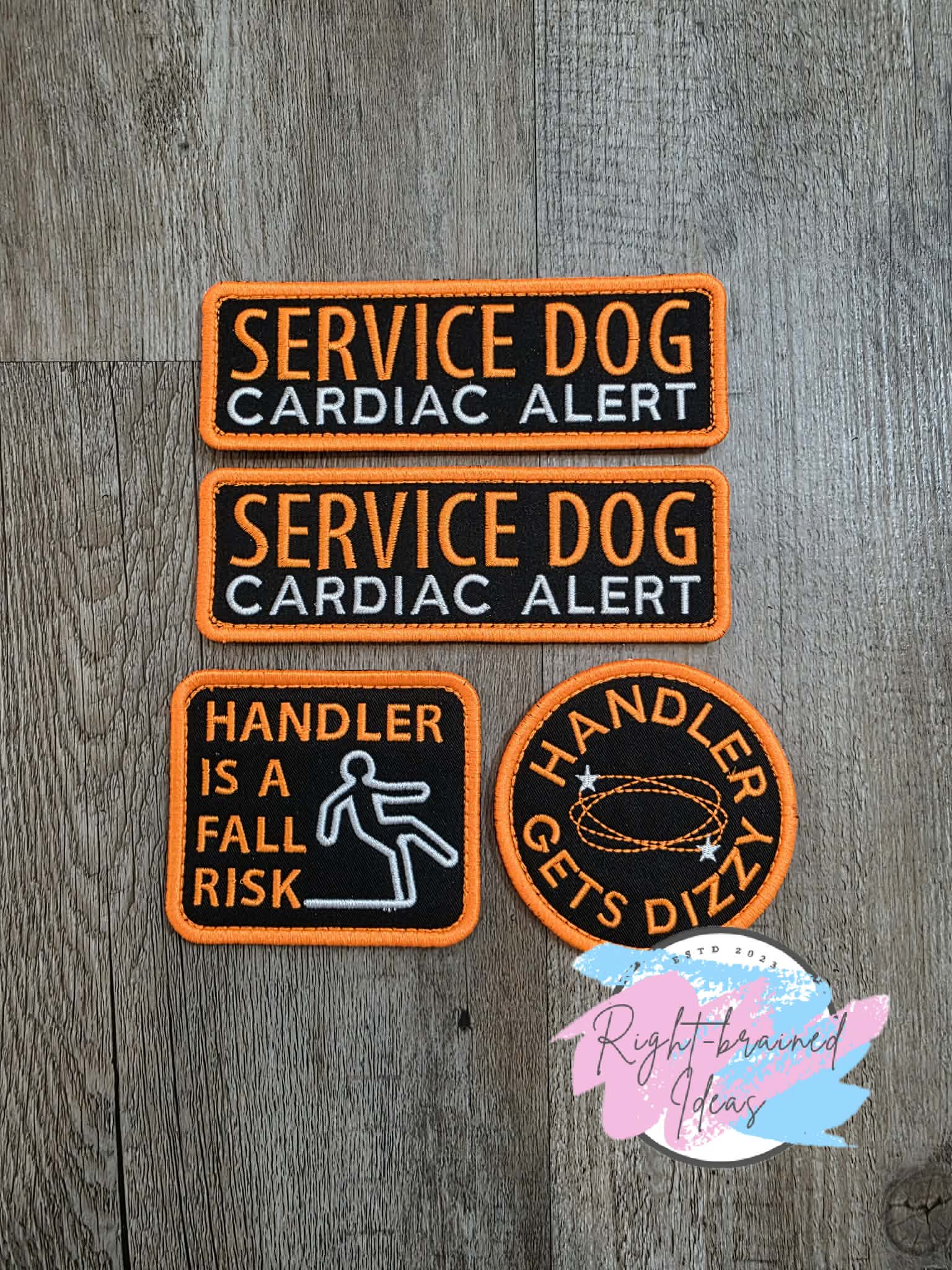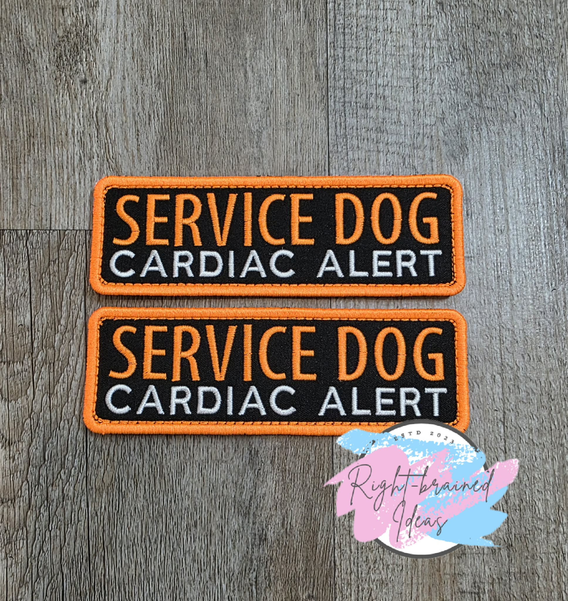(2) 6in x 2in black twill rectangular patches: "Service Dog" in neon orange and "Cardiac Alert" in white.