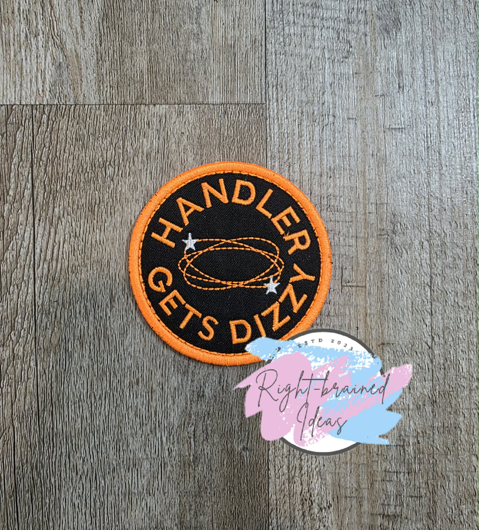 (1) 3.5in black twill circular patch: "Handler Gets Dizzy" in neon orange curved around a dizzy symbol with green lines and white stars.