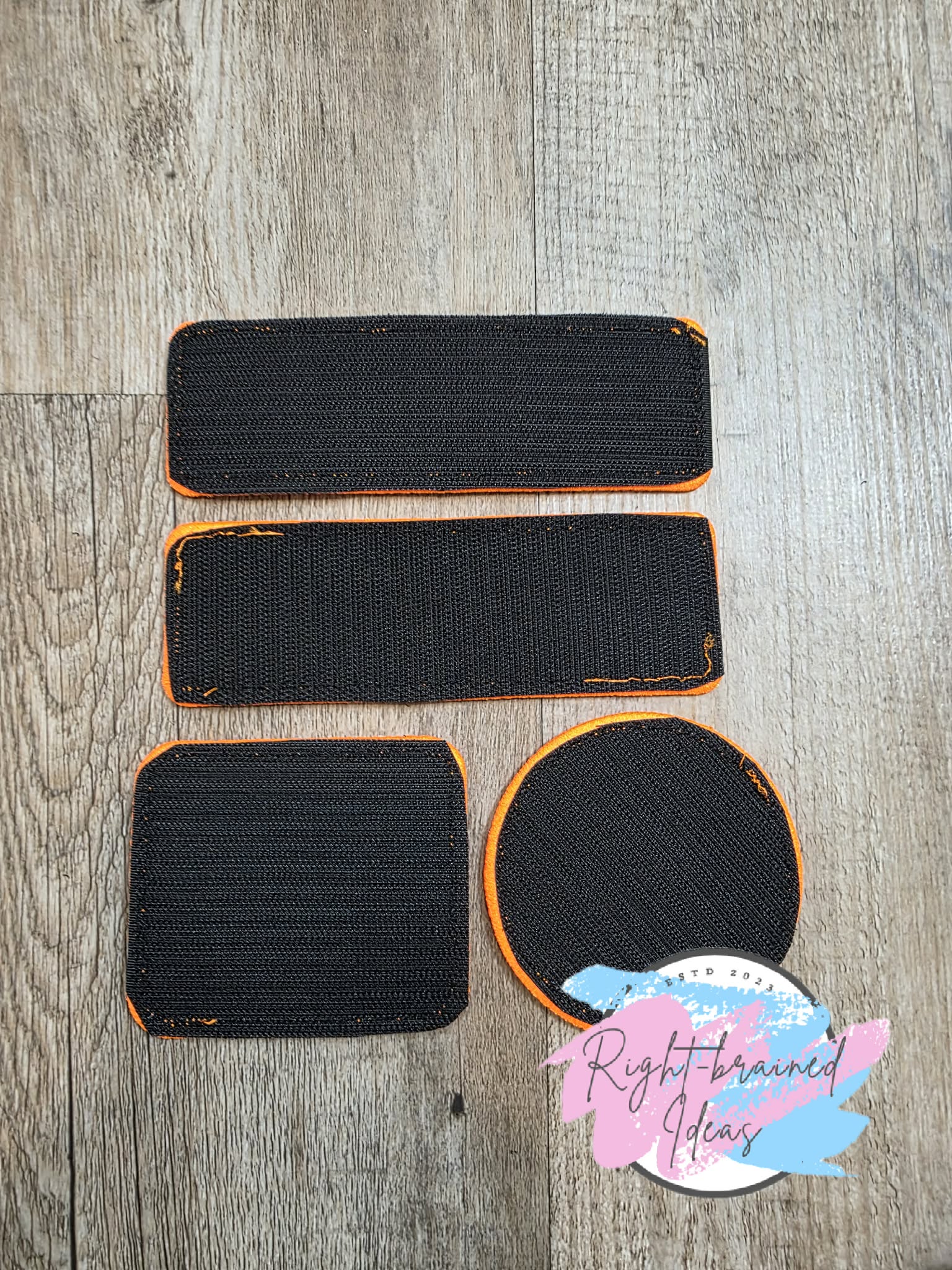 This is a four-piece patch set constructed of lightweight high performance black twill with neon orange and white embroidery thread. All patches have a neon orange satin border and velcro on the backside.