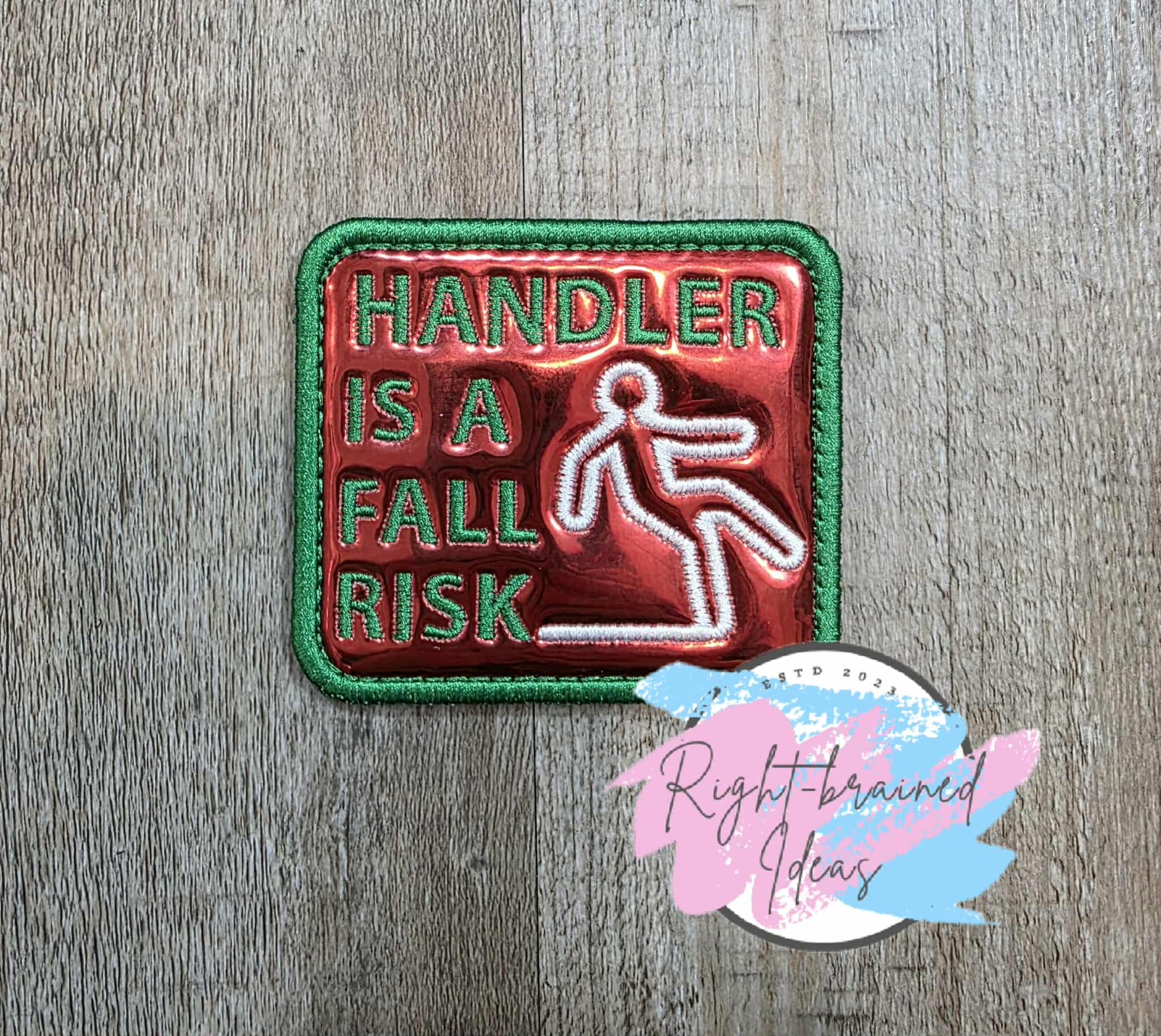 (1) 3.5in x 3in red metallic vinyl rectangular patch: "Handler Is A Fall Risk" in satin green next to an outline image of a falling human figure in white.
