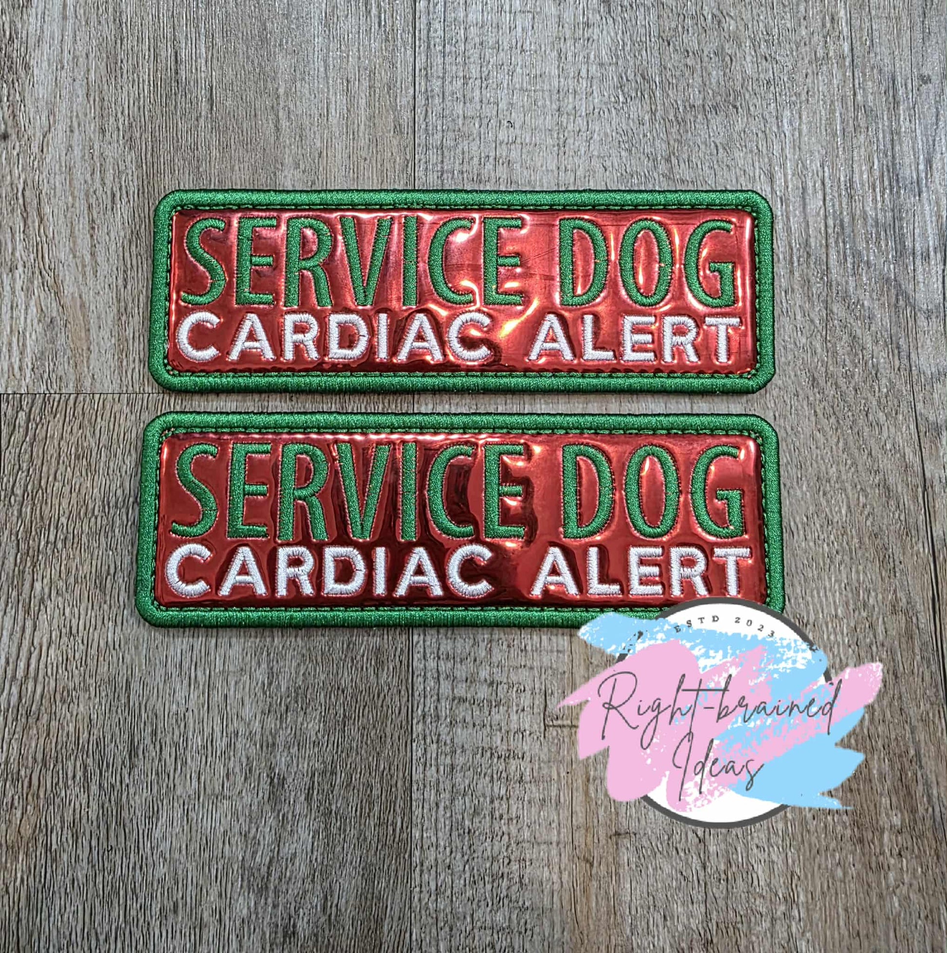 (2) 6in x 2in red metallic vinyl rectangular patches: "Service Dog" in satin green and "Cardiac Alert" in white.