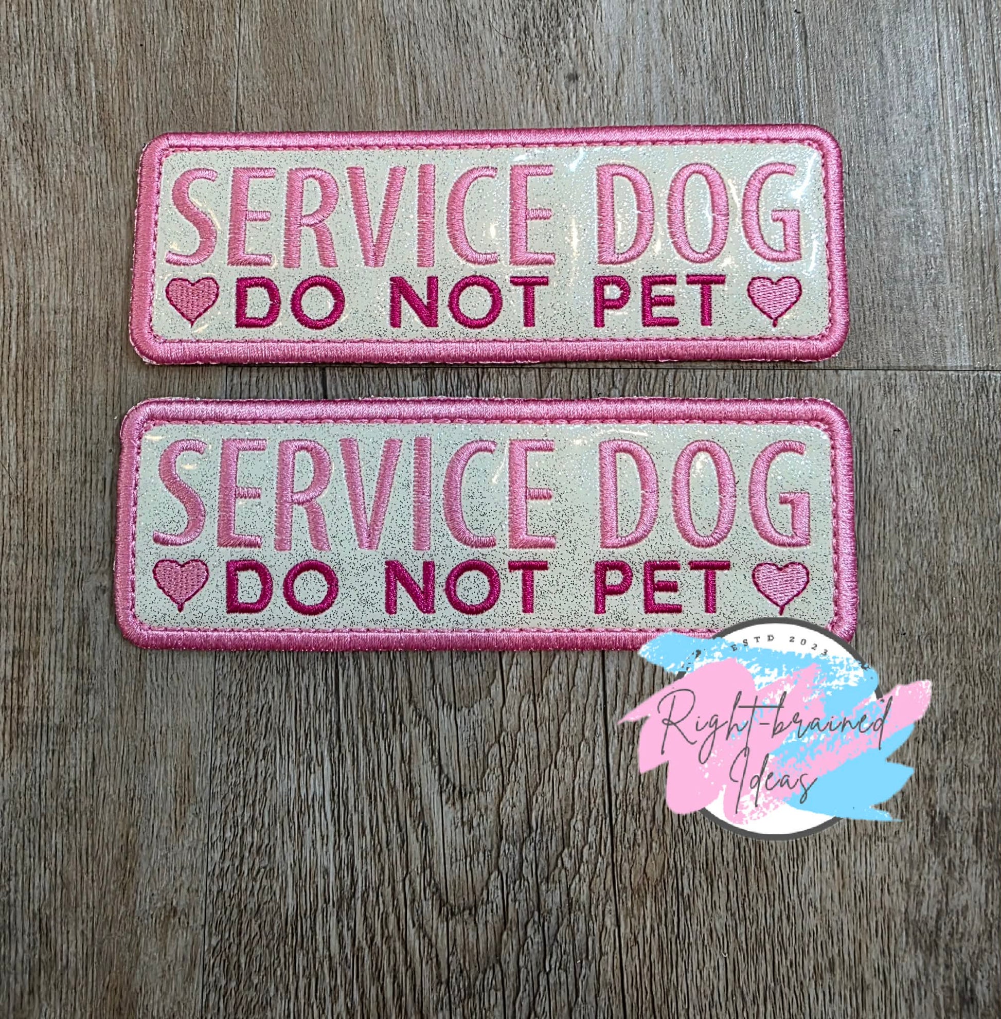 (2) 6in x 2in sparkle white vinyl rectangular patches: "Service Dog" in ballerina pink and "Do Not Pet" in fuchsia. There are two hearts in ballerina pink on either side of the words "do not pet".
