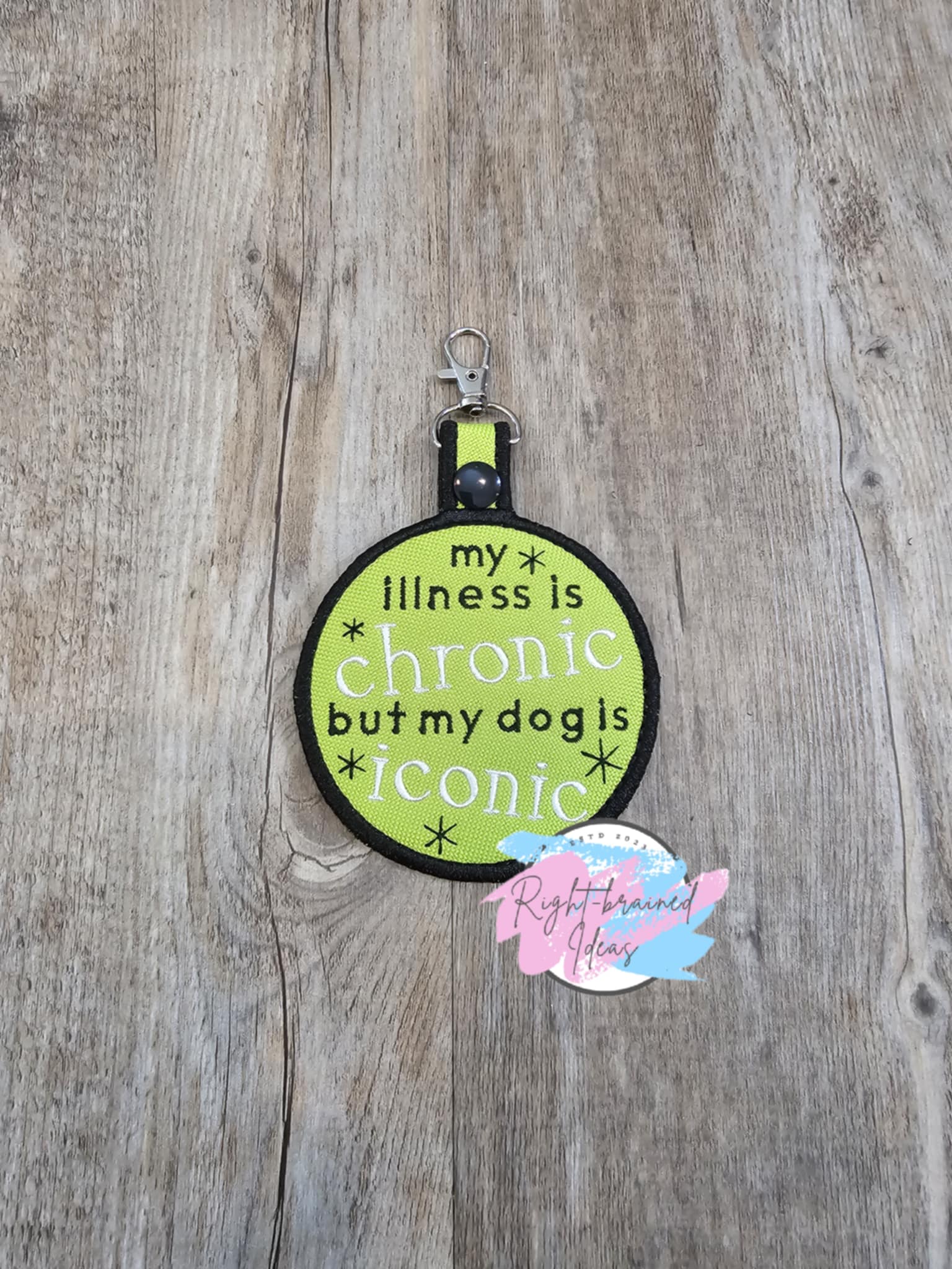 (1) 3.5in x 6in circular patch tab: "My illness is chronic, but my dog is iconic" with star symbols surrounding the text.