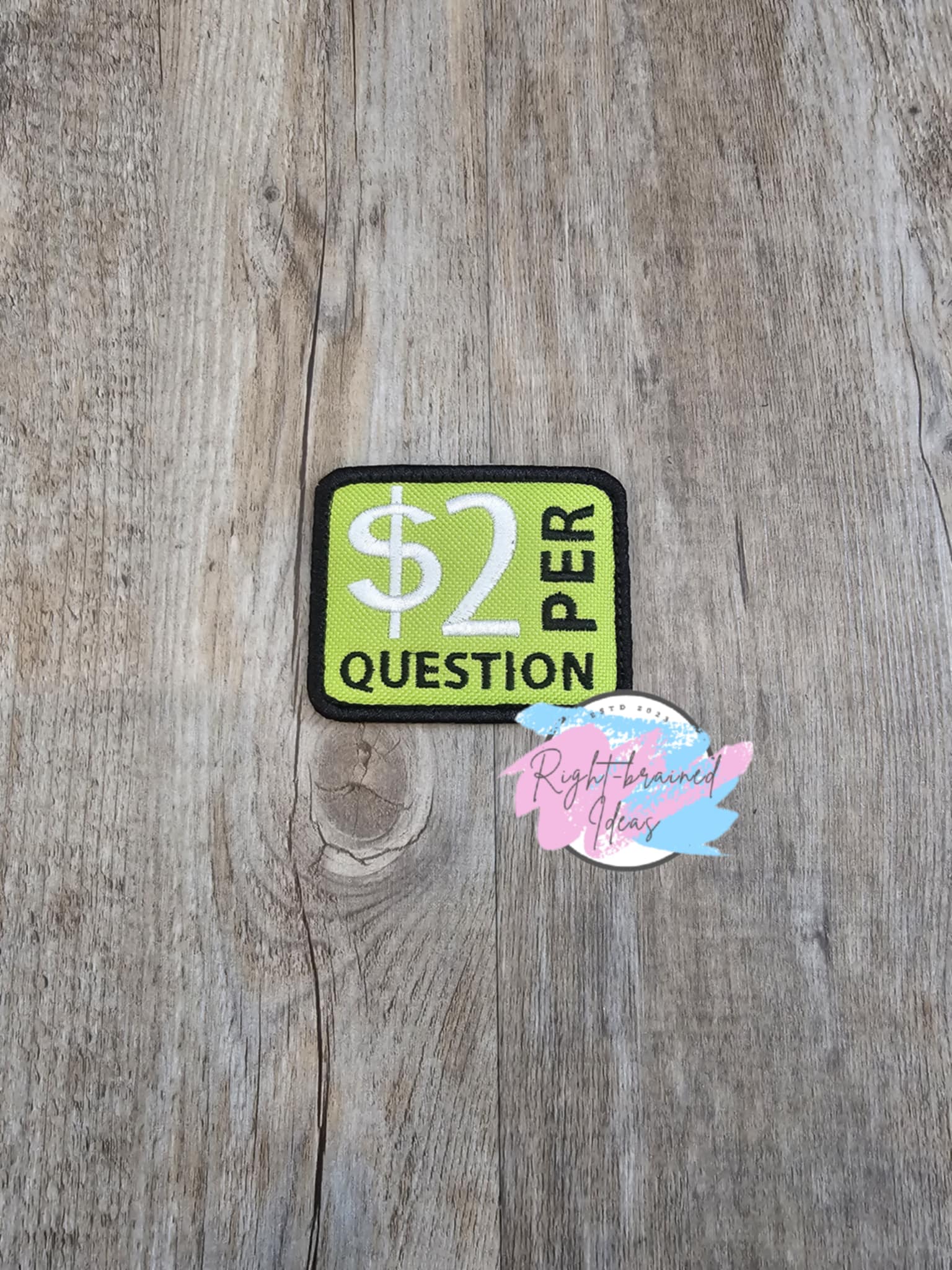 (2) 3in x 2.5in rectangular patch: "$2 Per Question" & "Staring is Tacky"
