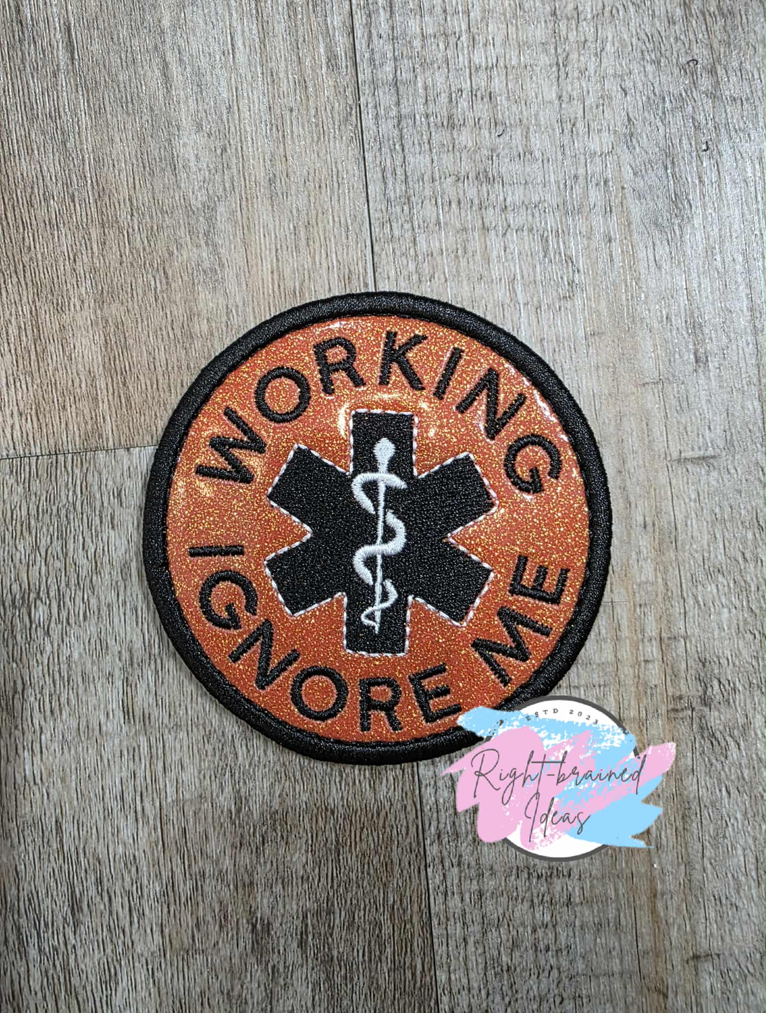(1) 3.5in sparkle burnt orange vinyl circular patch: "Working Ignore Me" in black around medical symbol in the middle of the patch in black and white thread.