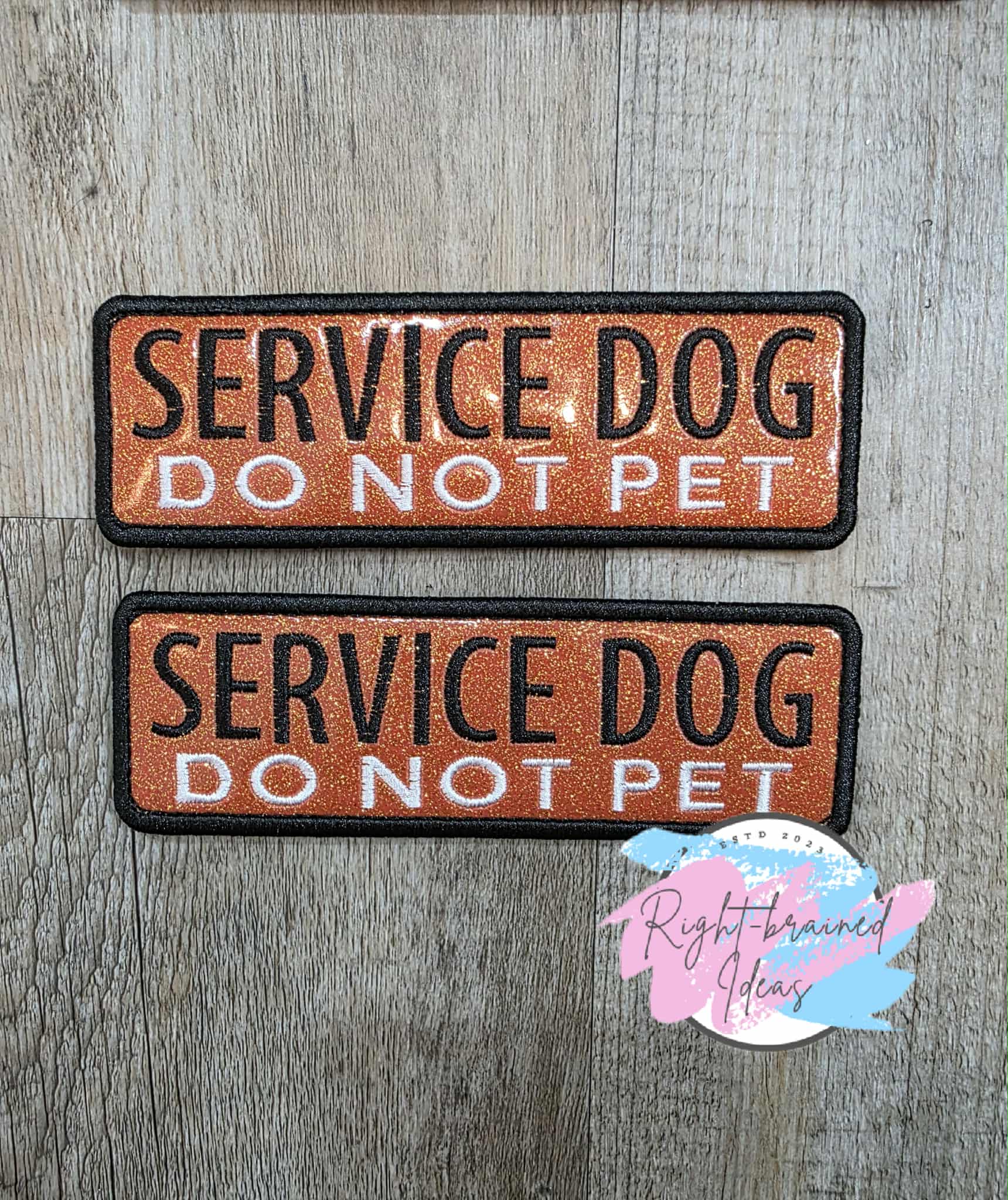 (2) 6in x 2in sparkle burnt orange vinyl rectangular patches: "Service Dog" in black with "Do Not Pet" underneath in white