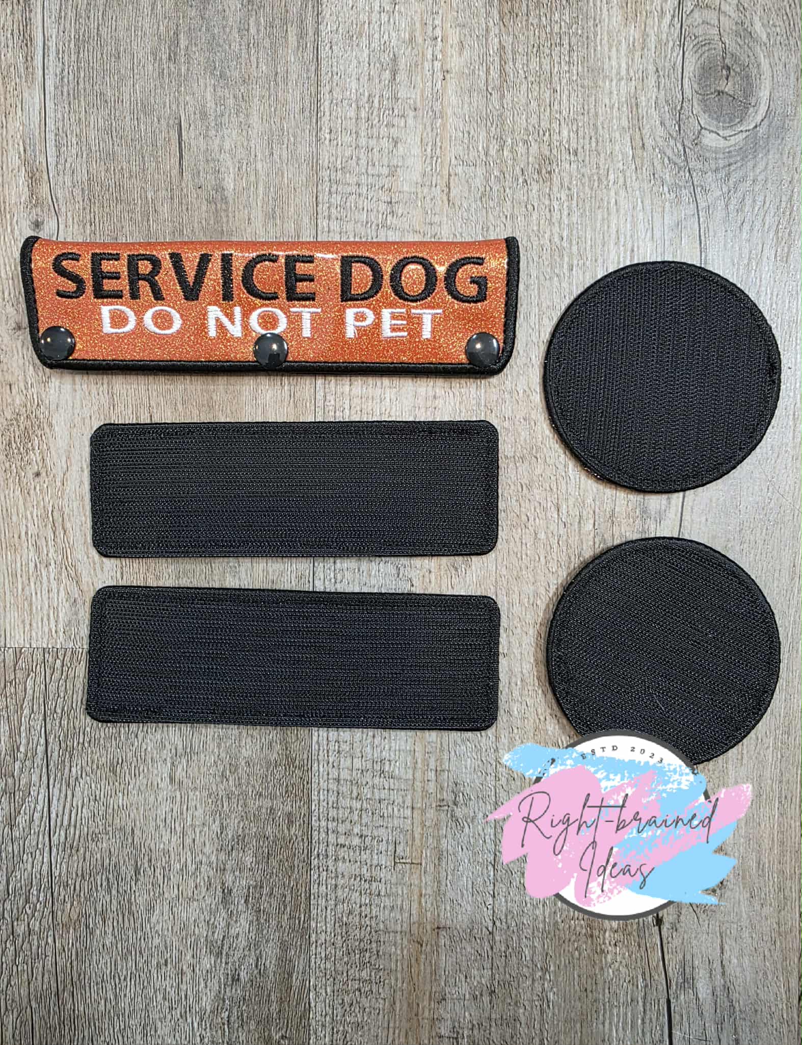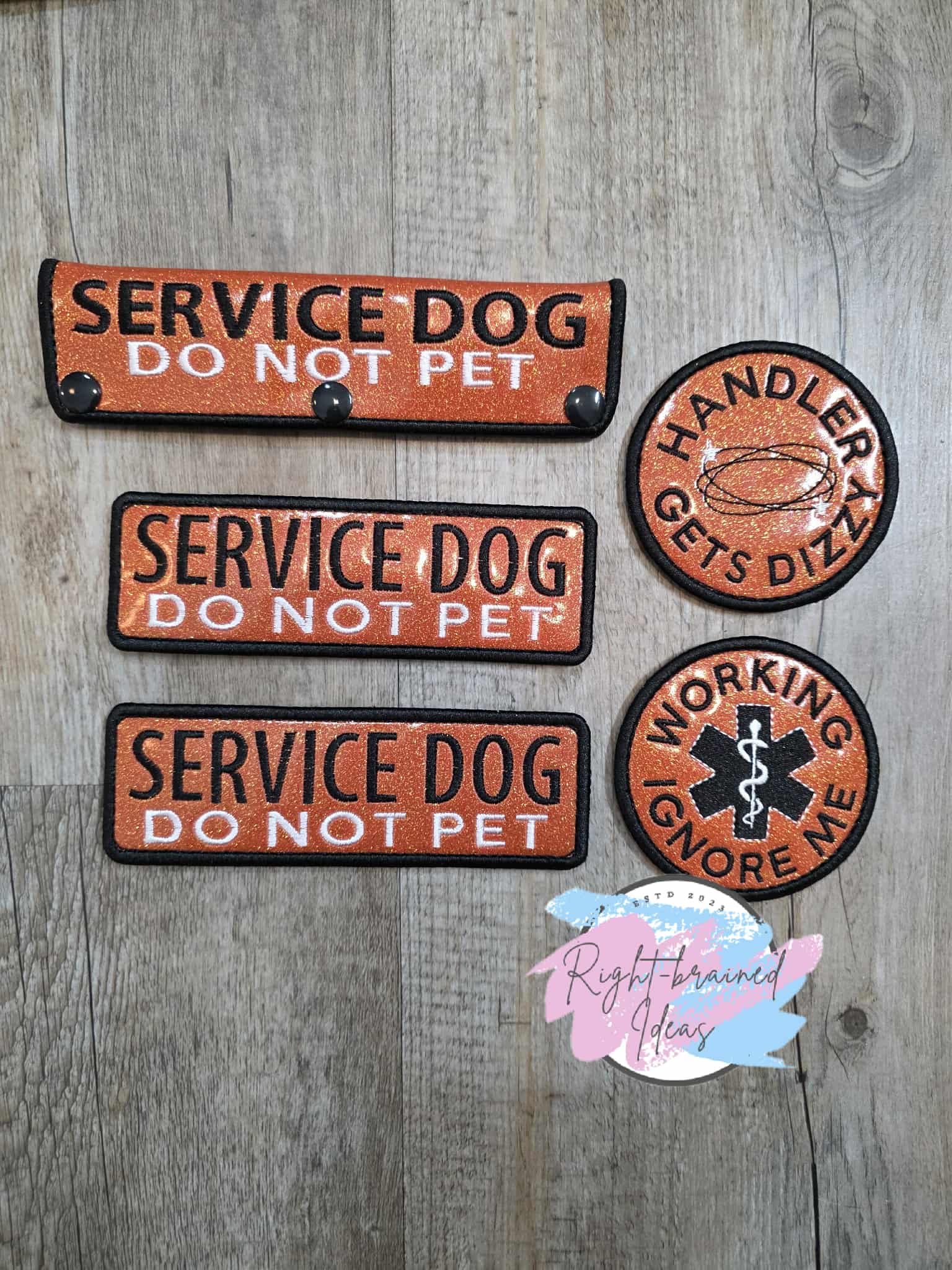 Service Dog Do Not Pet Black And White On Sparkle Burnt Orange Vinyl Five-piece Patch and Leash Wrap Set