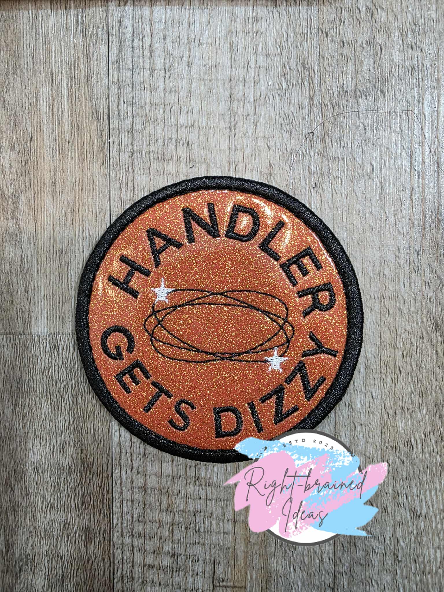 (1) 3.5in sparkle burnt orange vinyl circular patch: "Handler Gets Dizzy" in black with a dizzy symbol in the center of the patch in black with white stars.