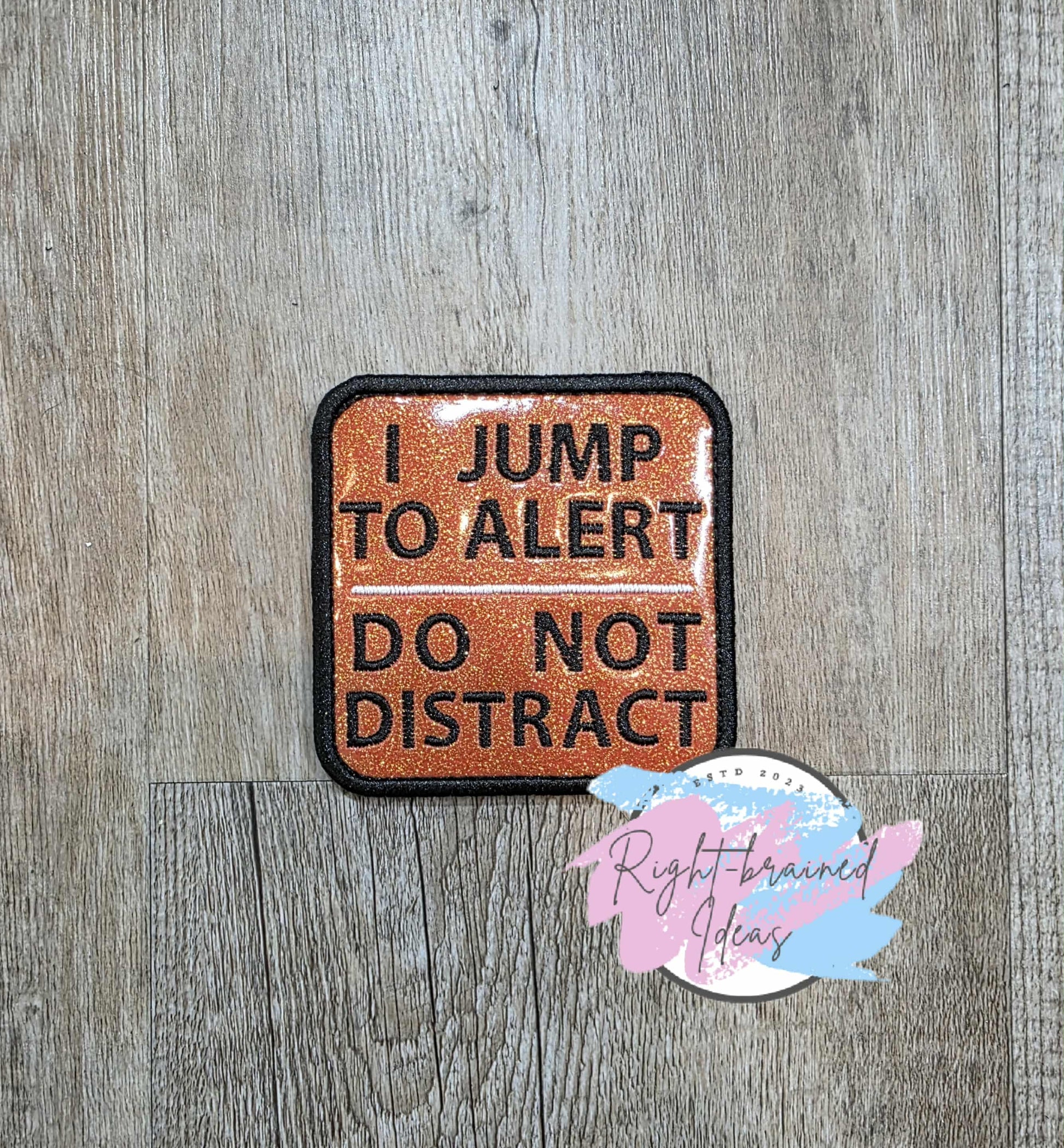 (1) 3.5in sparkle sky burnt orange square patch: "I Jump To Alert" and "Do Not Distract" in black with a white line in the center between the two phrases.