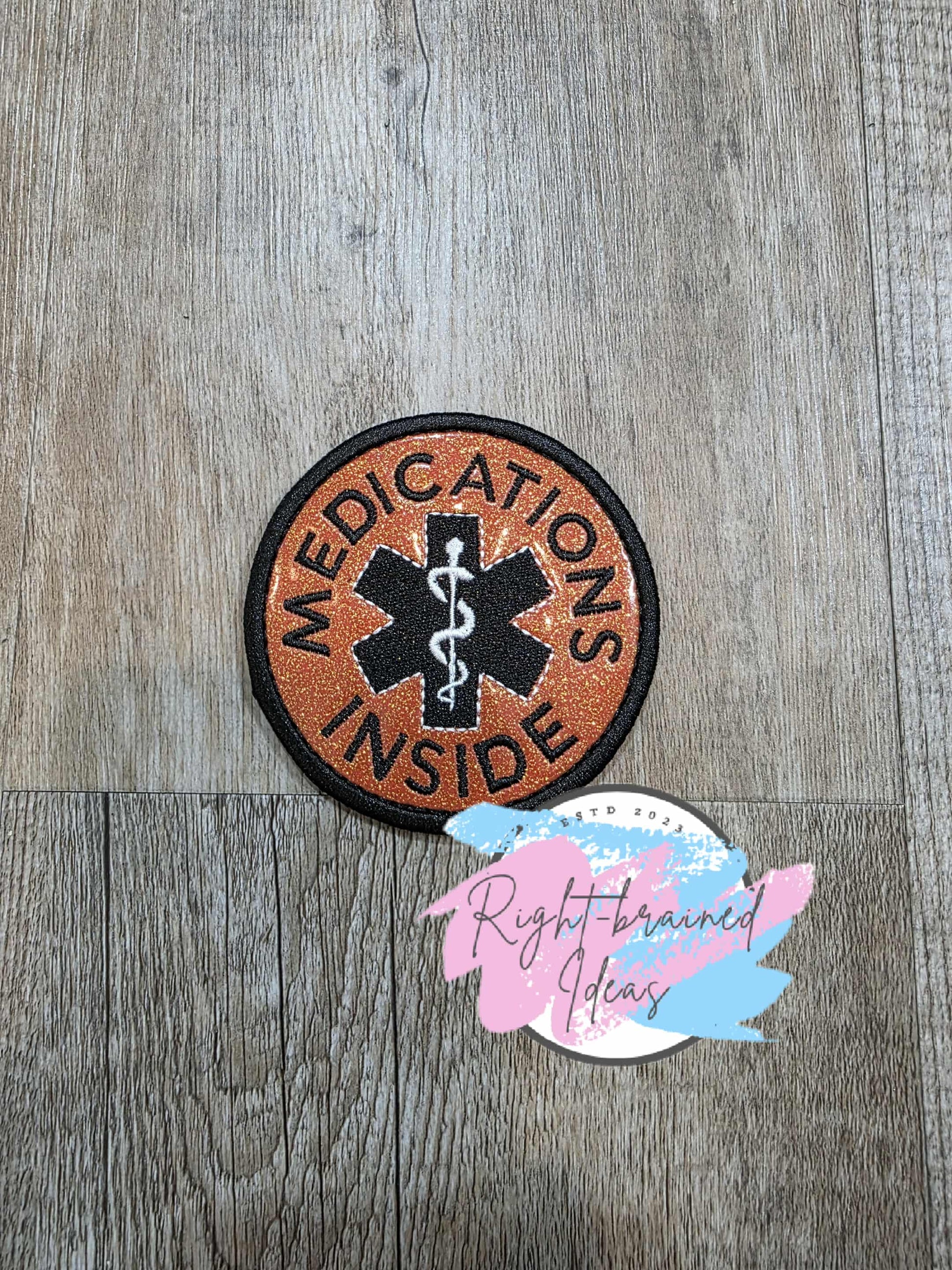 (1) 3.5in sparkle burnt orange vinyl circular patch: "Medications Inside" in black curved around a medical symbol that has a white staff over a black star.