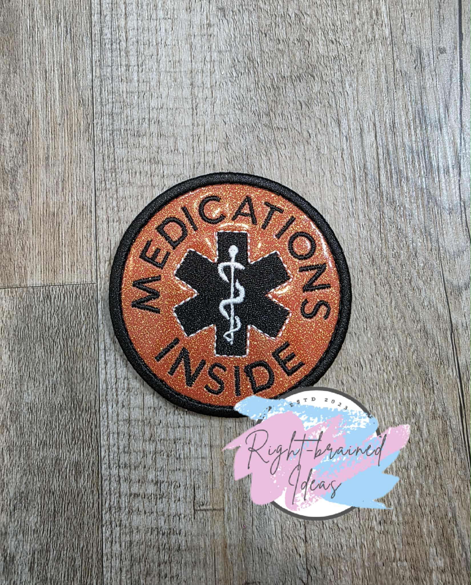 (1) 3in sparkle burnt orange vinyl circular patch: "Medications Inside" in black thread with a medical symbol has a white staff inside of a black star in the center of the patch.