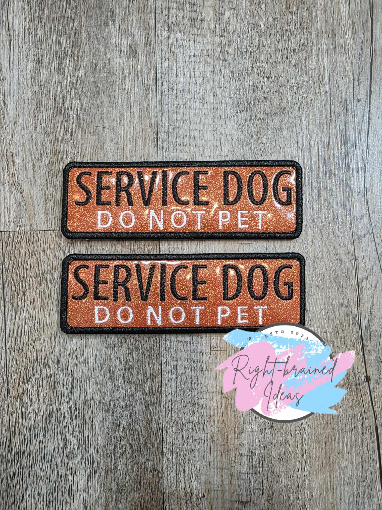(2) 6in × 2in sparkle burnt orange vinyl rectangular patches: "Service Dog" in black thread and "Do Not Pet" in white thread.