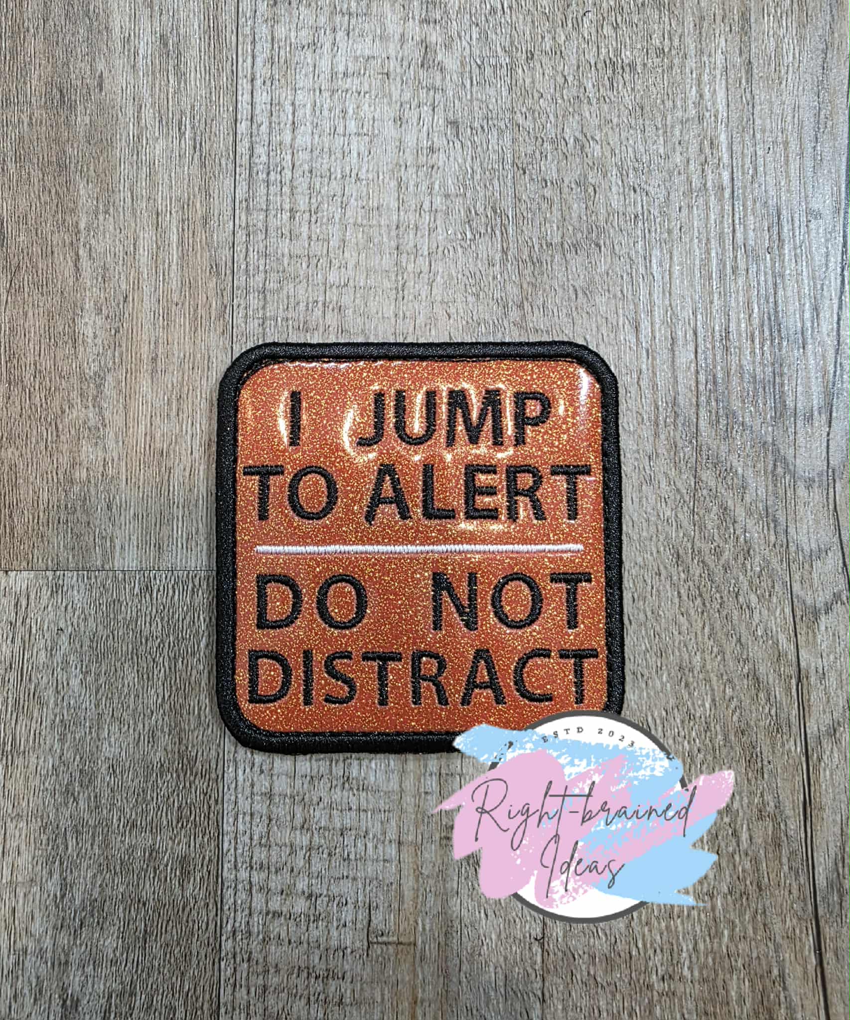 (1) 3.5in sparkle burnt orange vinyl square patch: "I Jump To Alert" and "Do Not Distract" in black thread with a white line in the middle between the two phrases.