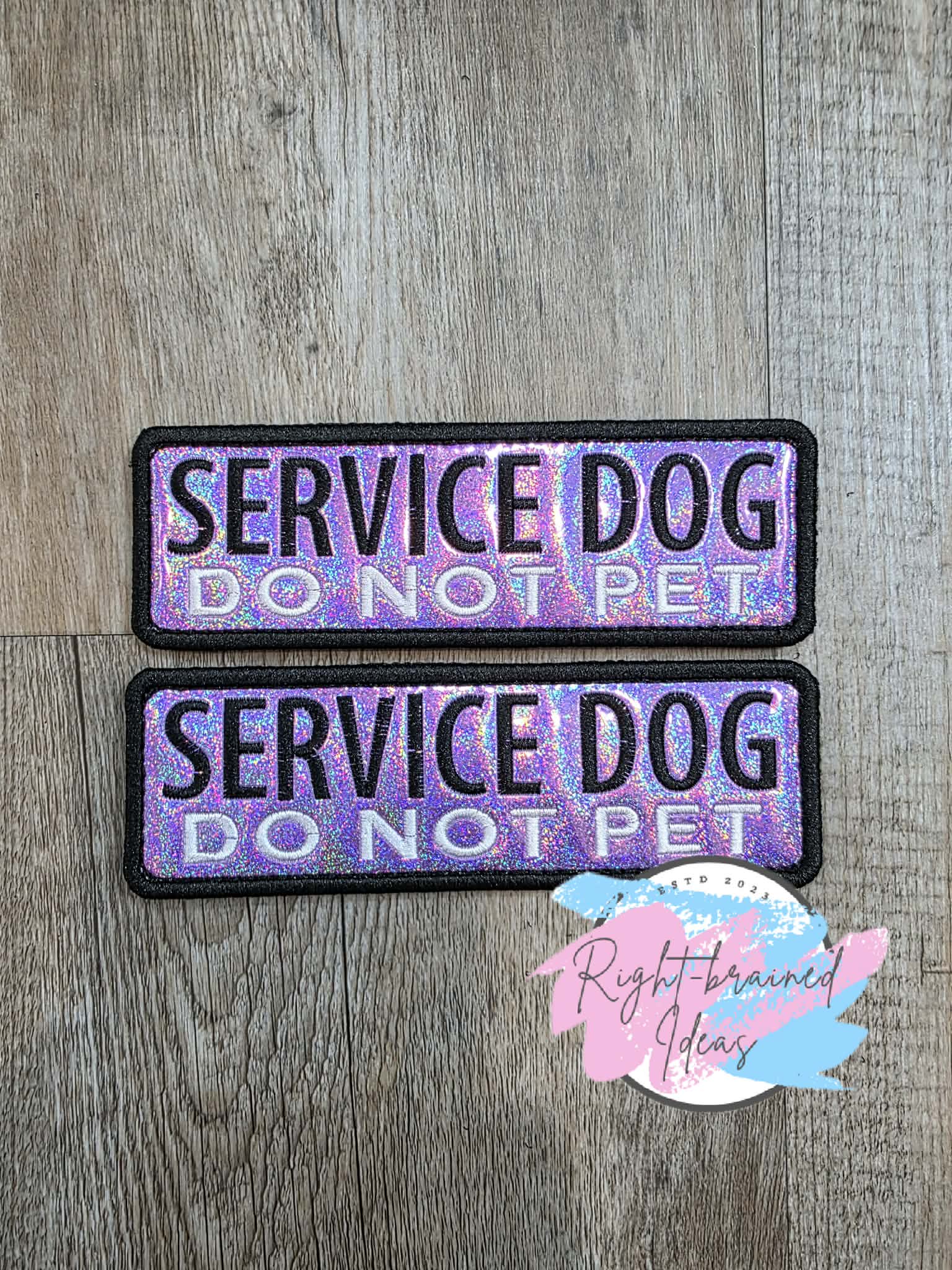 (2) 6in x 2in sparkle purple holographic vinyl rectangular patches: "Service Dog" in black. "Do Not Pet" in white.