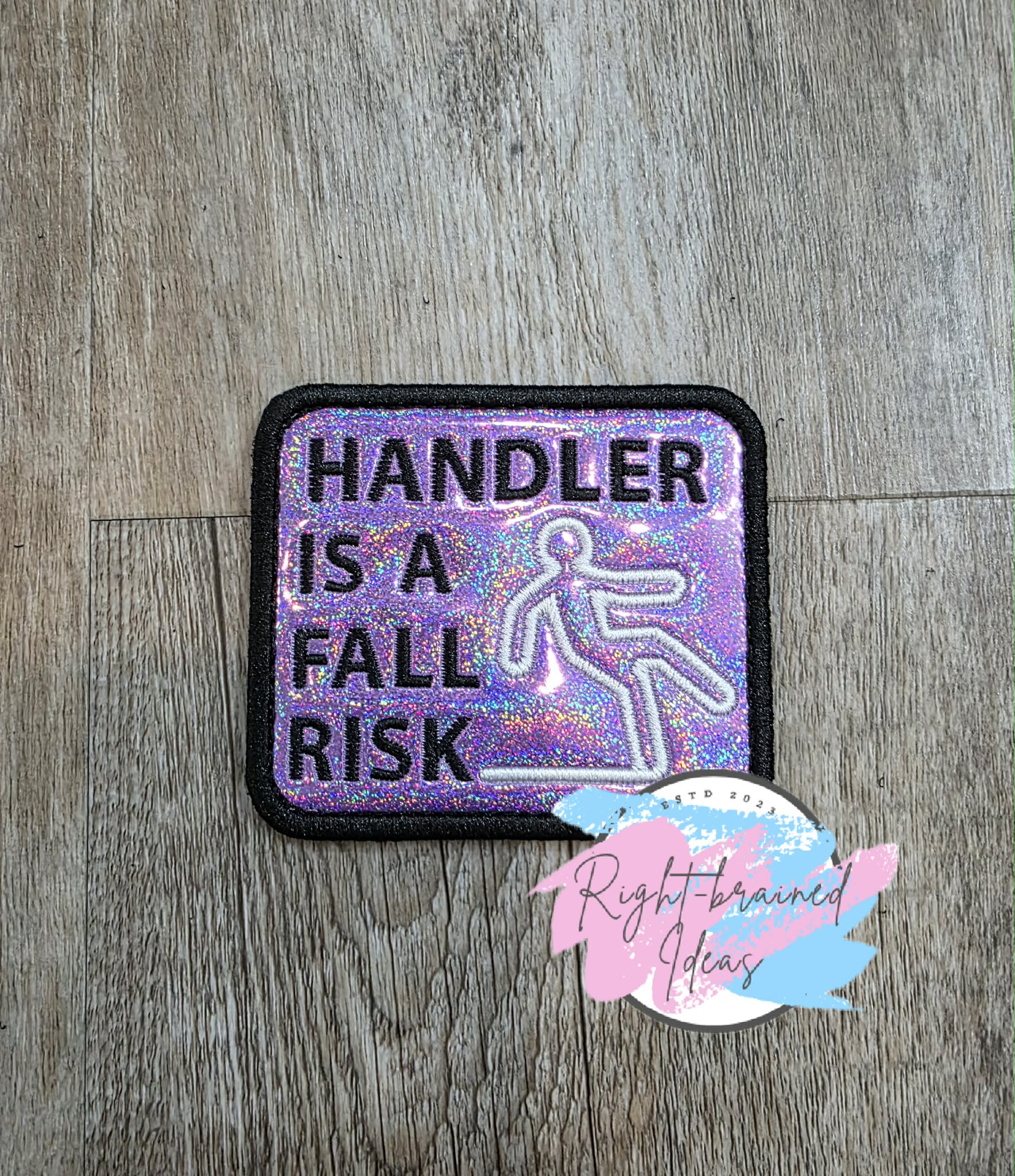 "Handler Is A Fall Risk" in black next to an outlined image of a falling human figure in white.