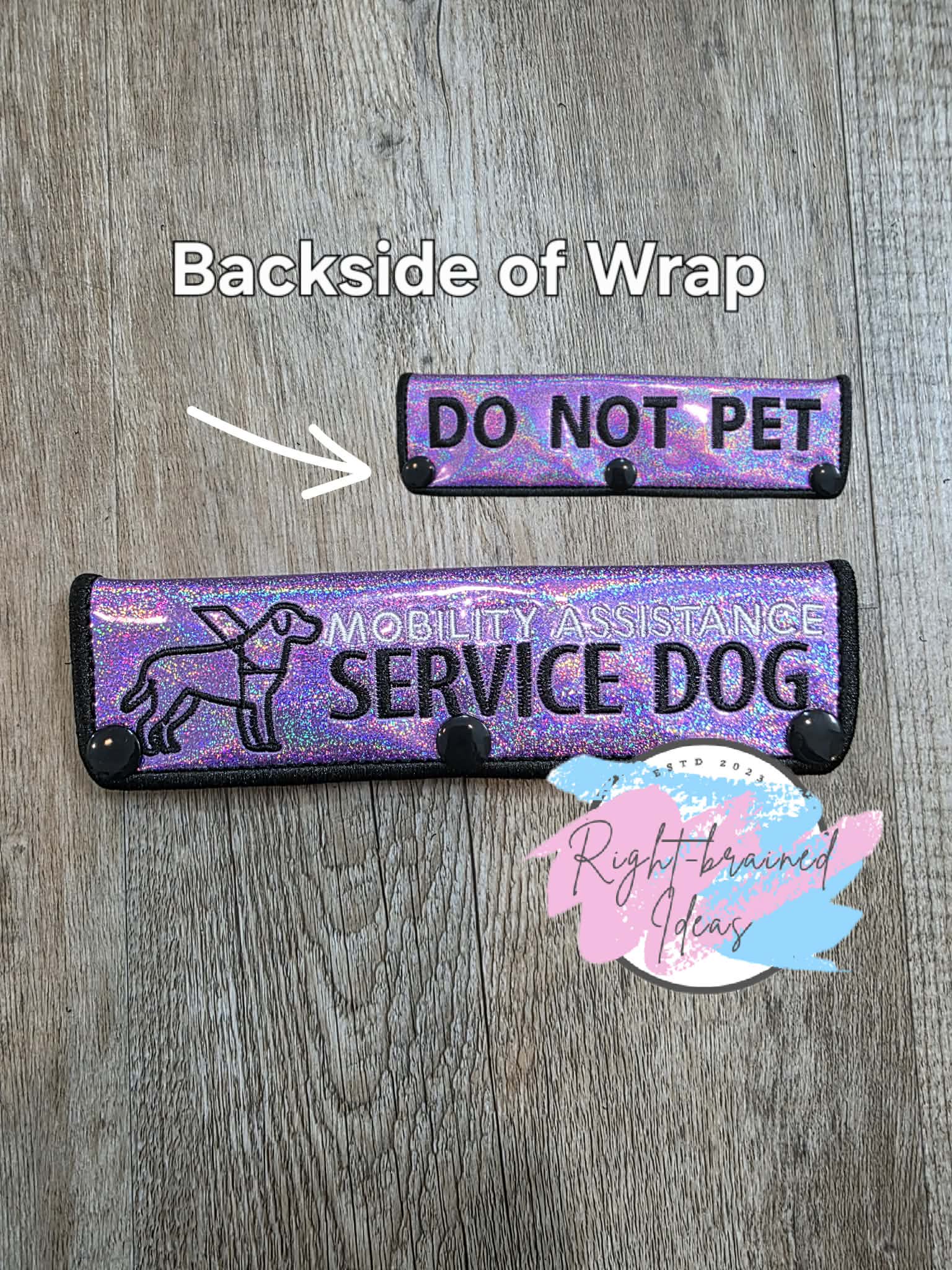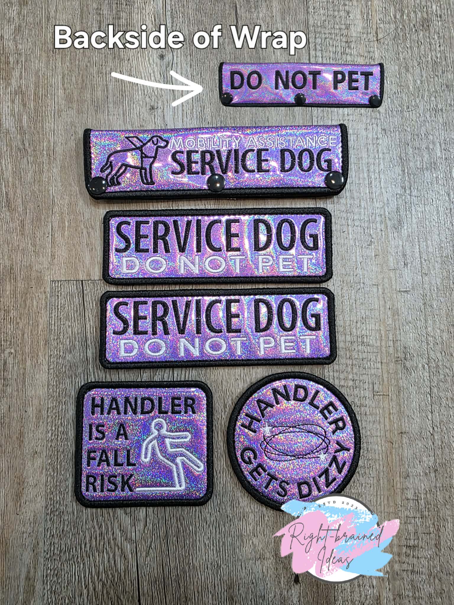 Service Dog Do Not Pet Black And White On Sparkle Purple Holographic Vinyl Five-piece Patch And Double-sided Leash Wrap Set