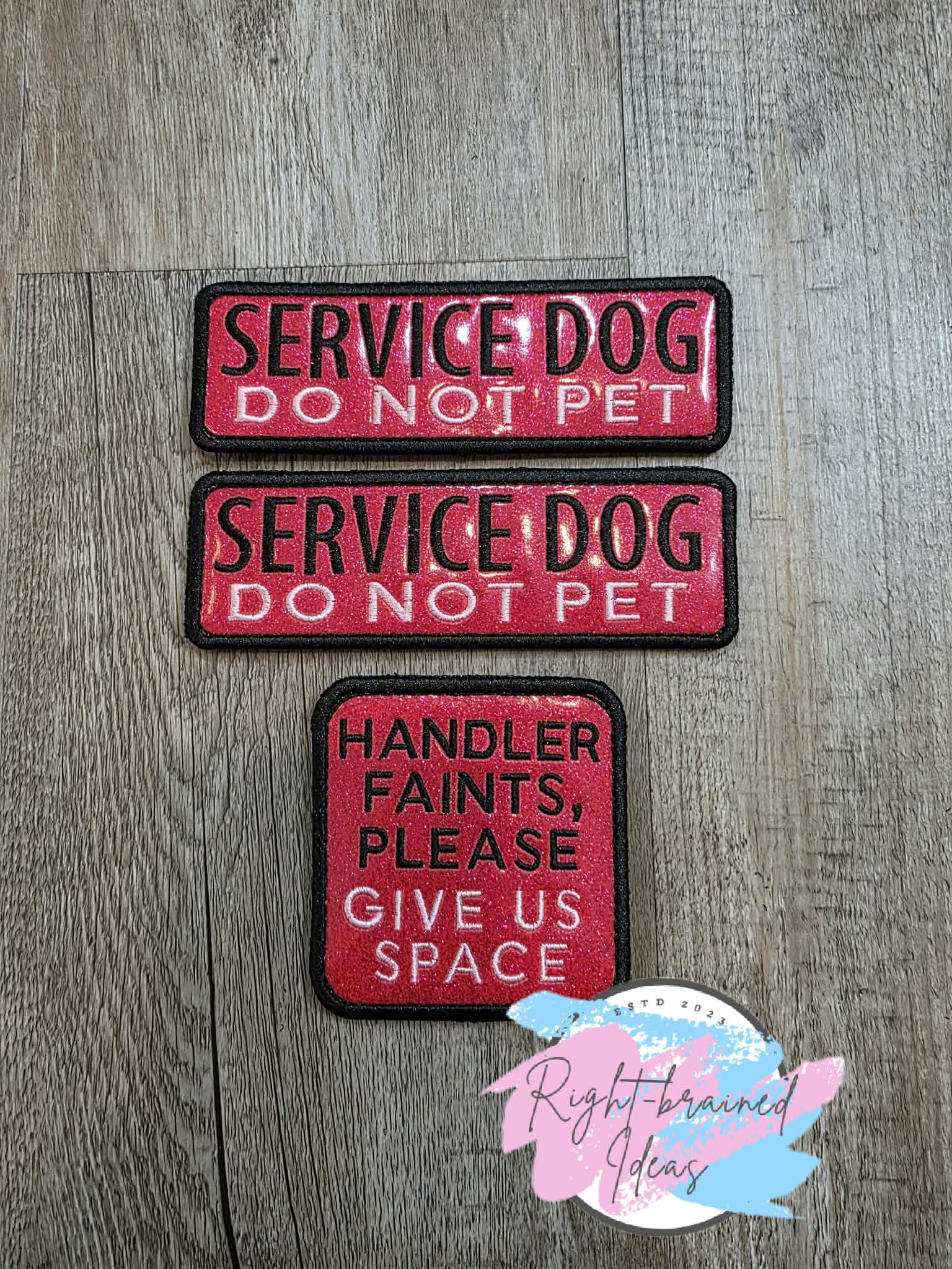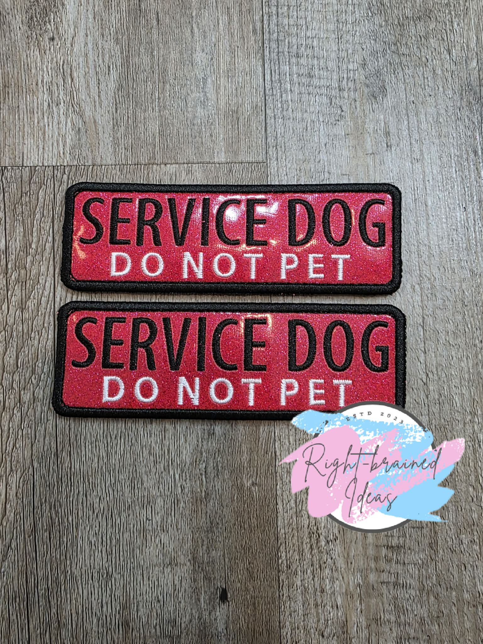 (2) 6in x 2in sparkle red vinyl rectangular patches: "Service Dog" in black and "Do Not Pet" in light pink.