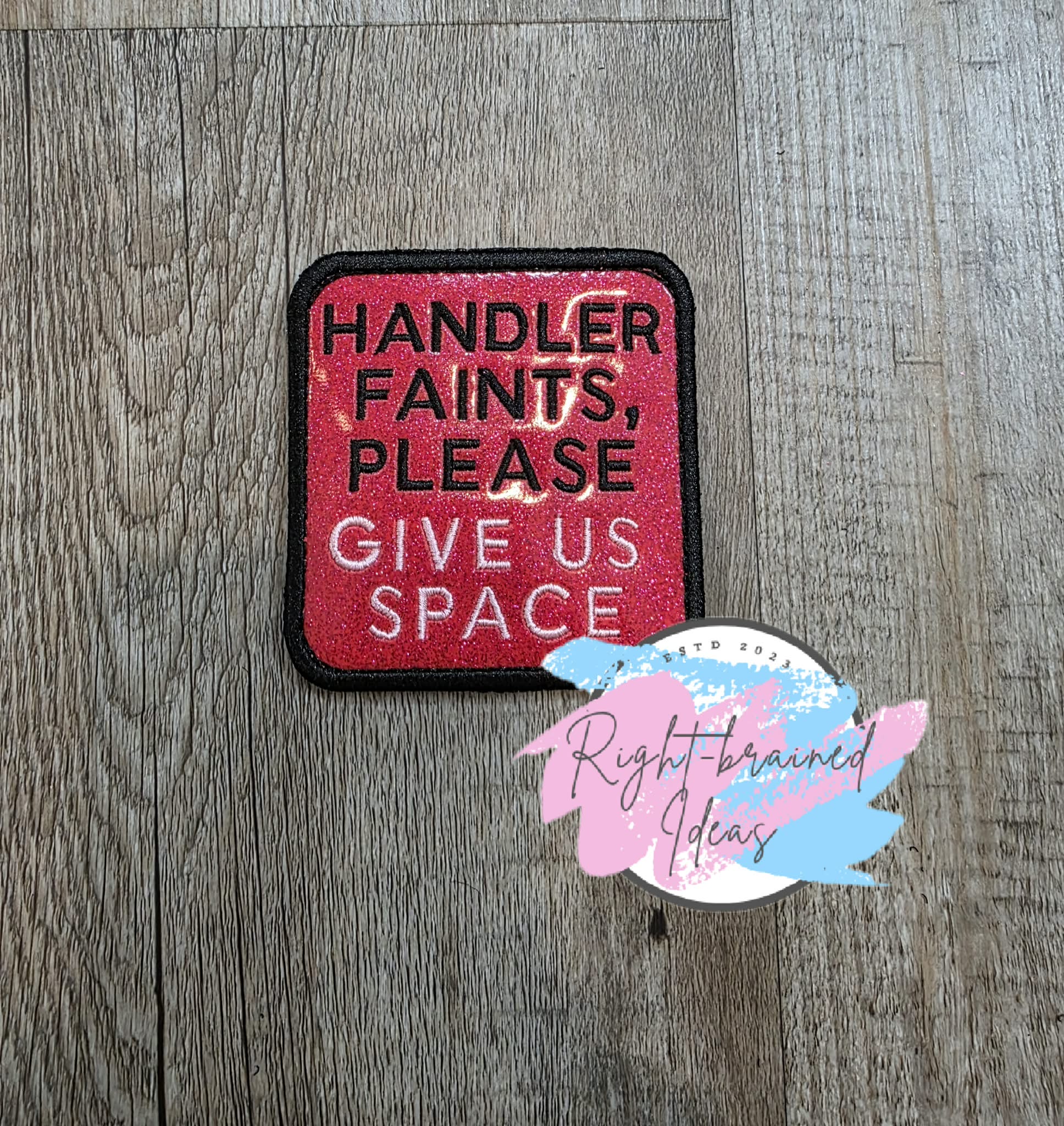 (1) 4in x 3.5 sparkle red vinyl rectangular patch: "Handler Faints, Please" in black and "Give Us Space" in light pink.