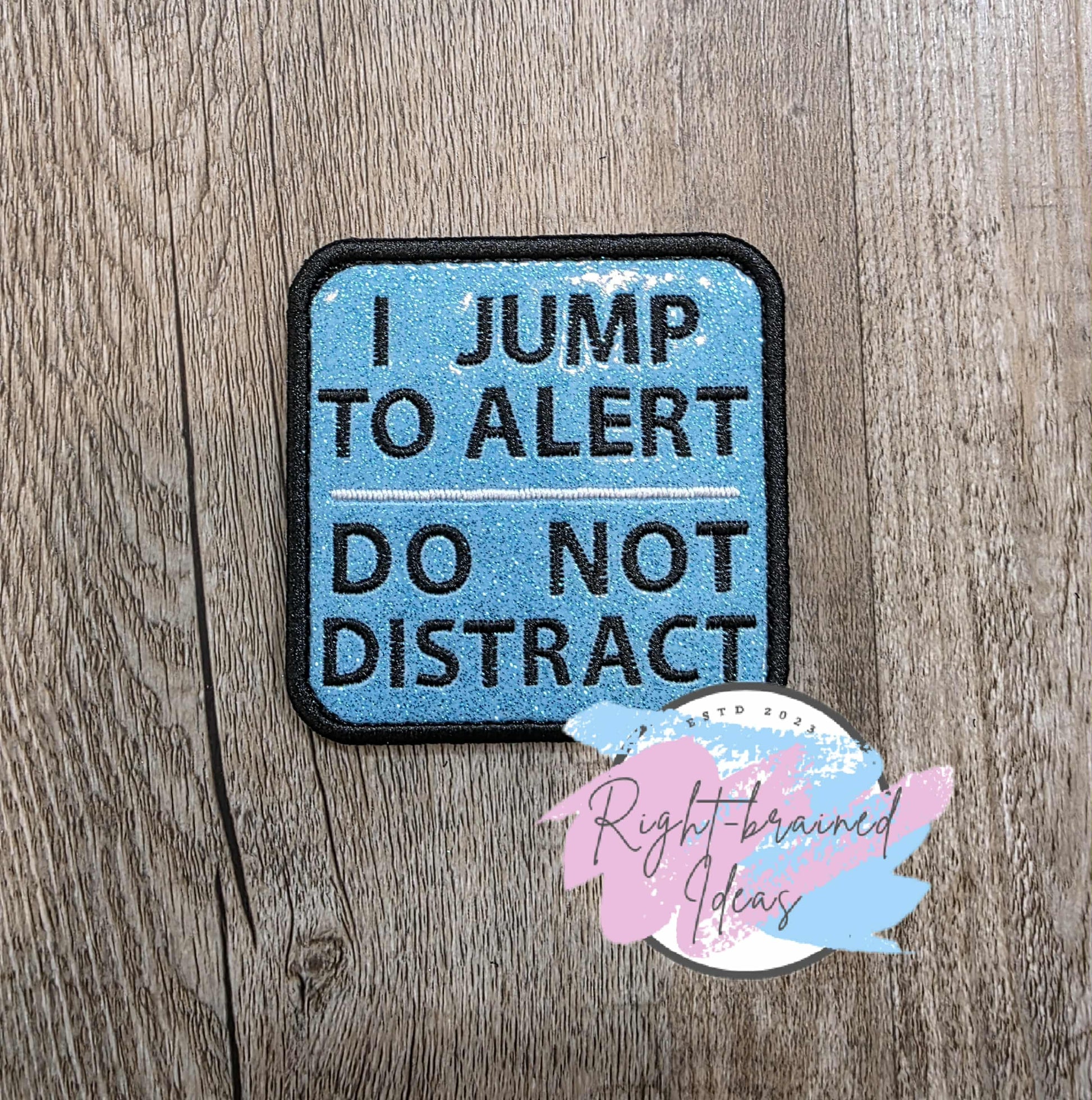 (1) 3.5in sparkle white vinyl square patch: "I Jump To Alert" and "Do Not Distract" in black. There is a white line between the phrases.