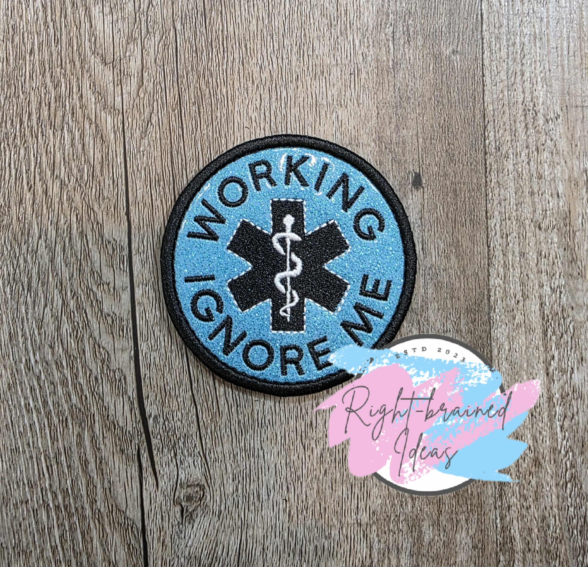 (1) 3.5in sparkle white vinyl circular patch: "Working Ignore Me" in black curved around a medical symbol that has a white staff over a black star in the center.