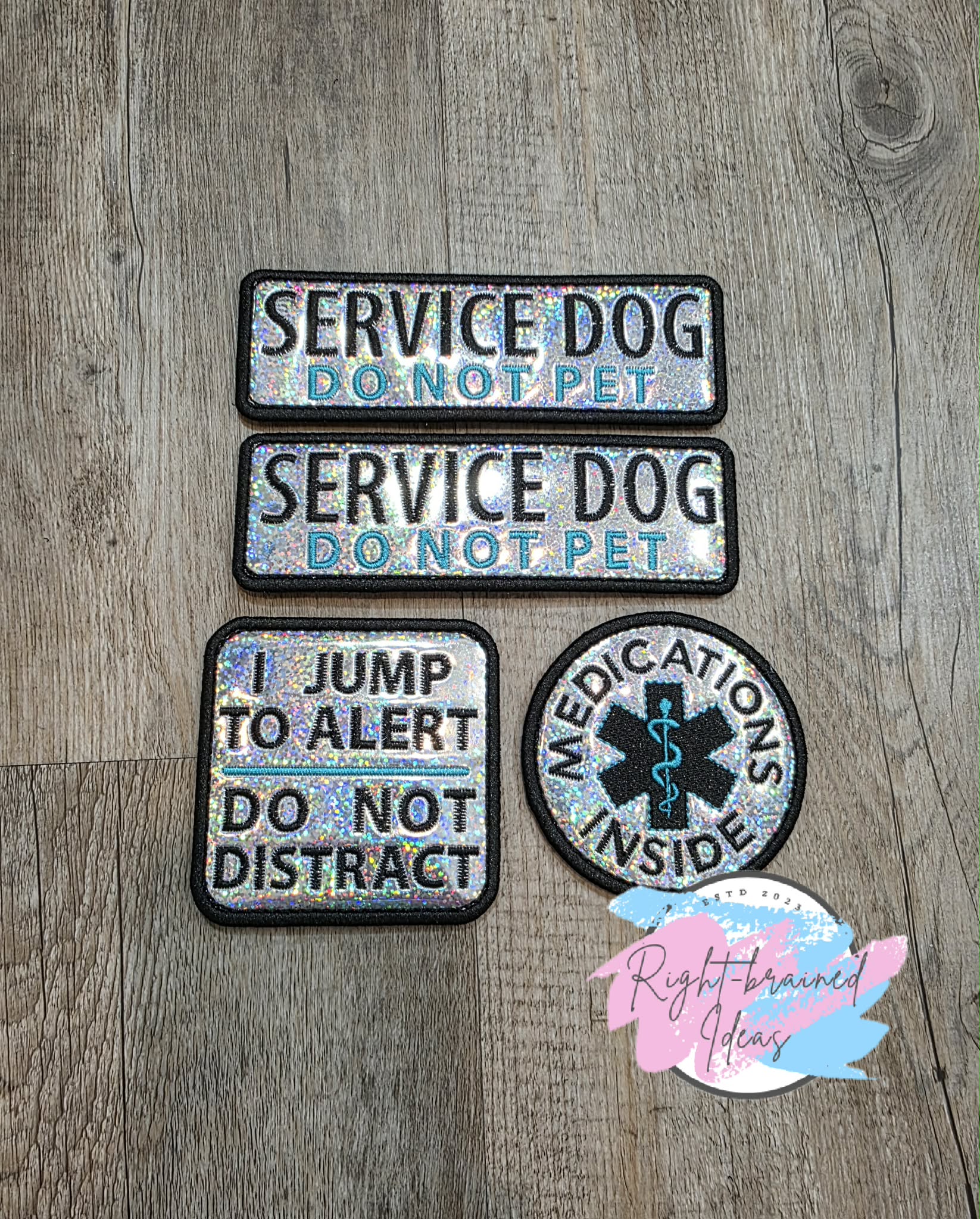 Service Dog Do Not Pet Teal And Black On Sparkle Silver Holographic Vinyl Four-piece Patch Set