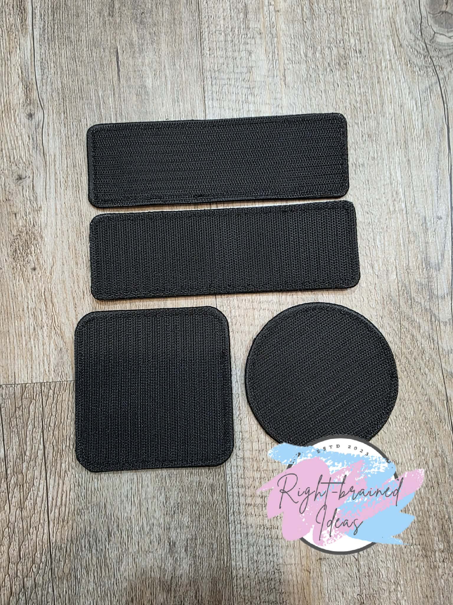 This is a four-piece patch set constructed of sparkle silver holographic vinyl with teal and black embroidery thread. All patches have velcro sewn on the backside and black satin borders.