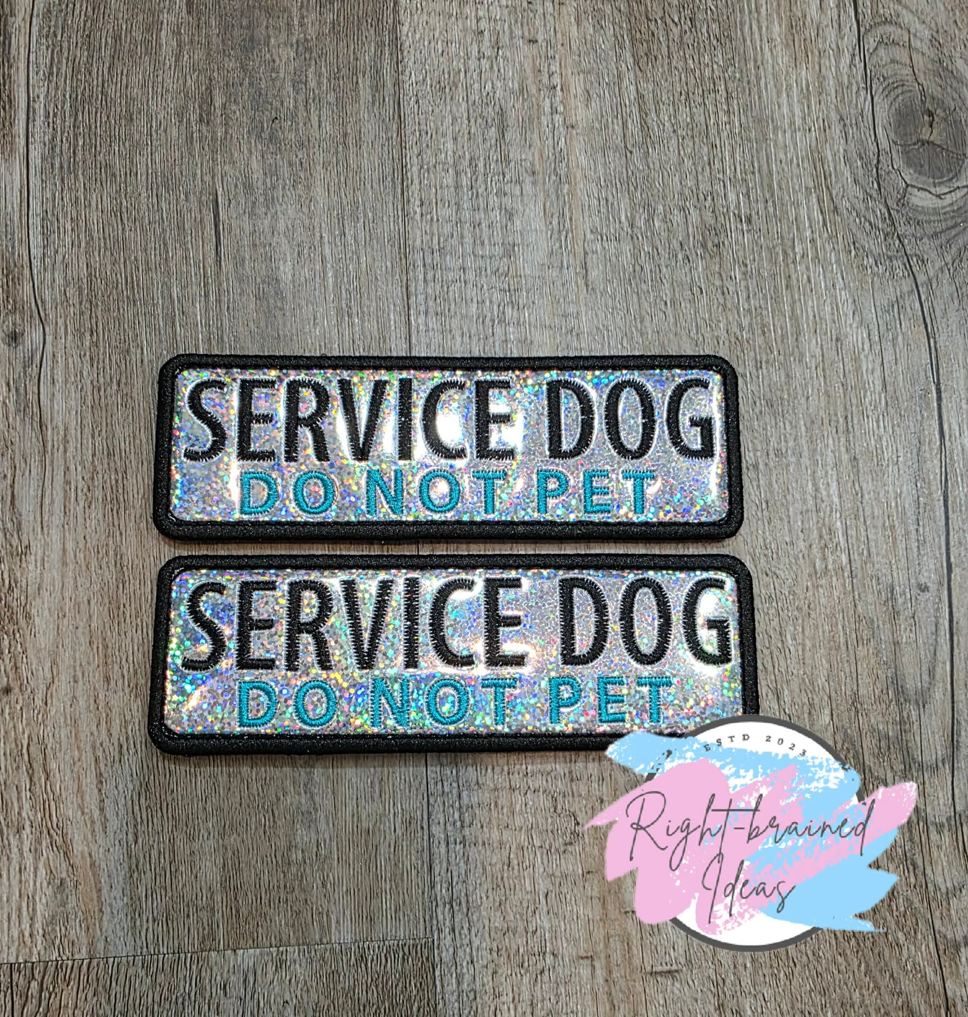 (2) 6in x 2in sparkle silver holographic vinyl rectangular patches: "Service Dog" in black and "Do Not Pet" in teal.