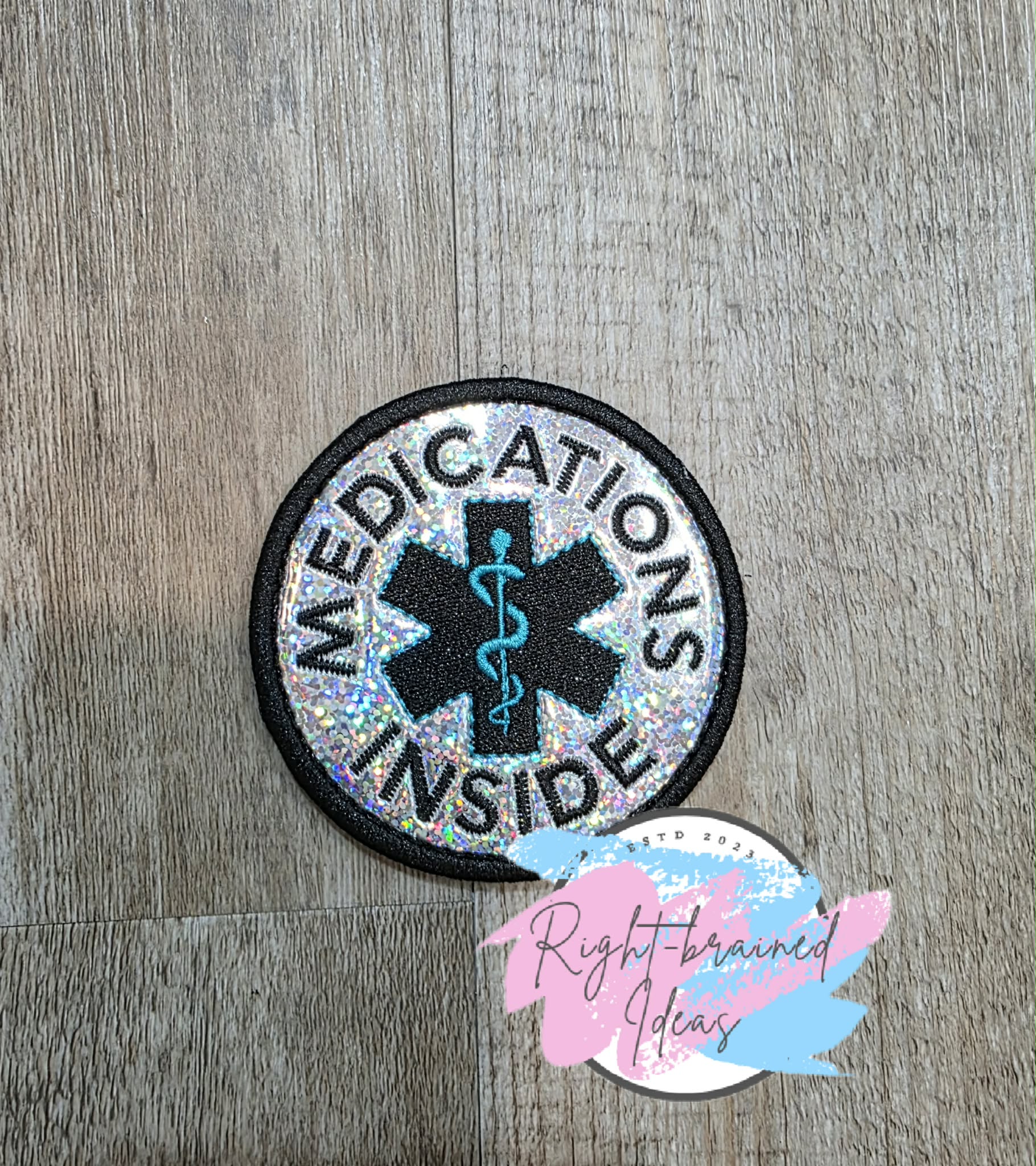 (1) 3.5in sparkle silver holographic vinyl circular patch: "Medication Inside" in black curved around a medical symbol with a teal staff over a black star.