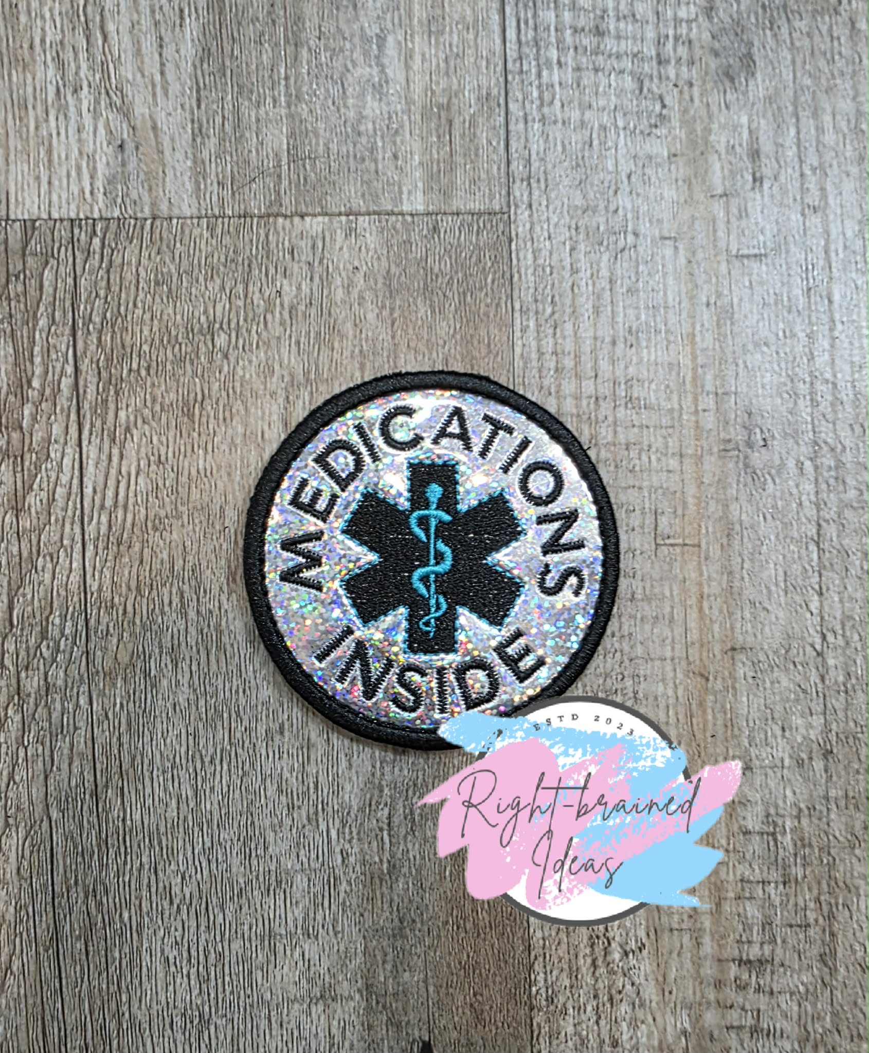 (1) 3in sparkle silver holographic vinyl circular patch: "Medication Inside" in black curved around a medical symbol consisting of a white staff over a black star in the center of the patch.