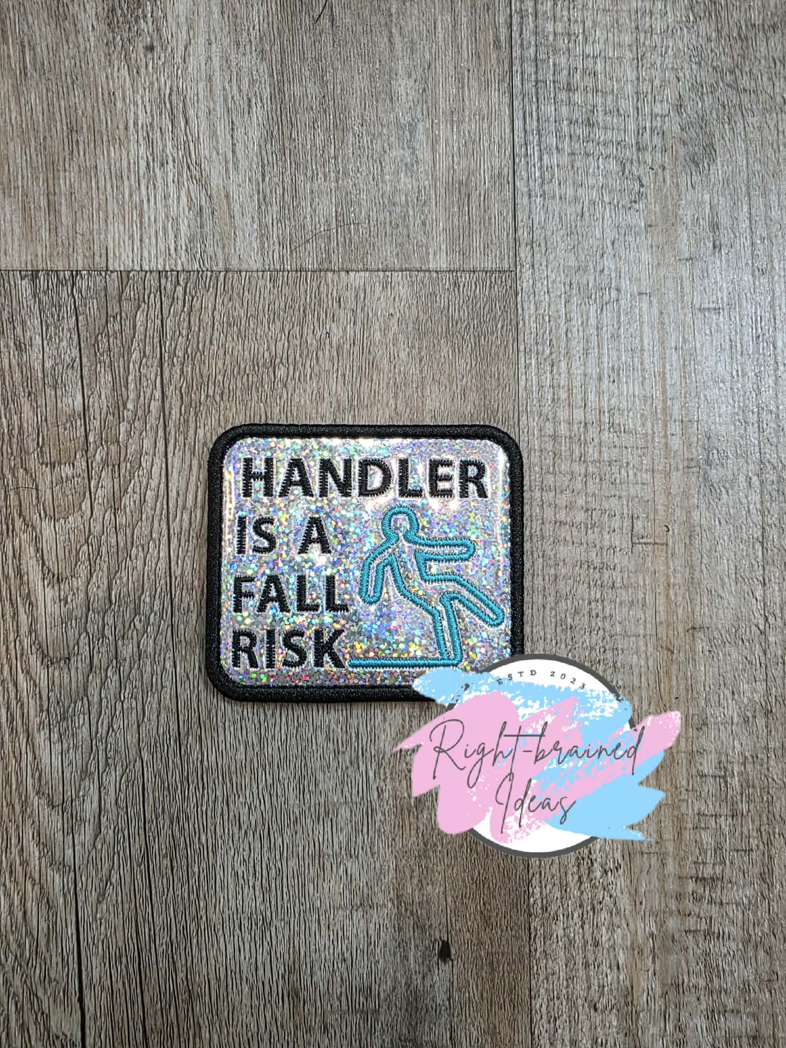 (1) 3.5in x 3in sparkle silver holographic vinyl rectangular patch: "Handler Is A Fall Risk" in black thread next to an outlined image of a falling human figure symbol in teal thread.