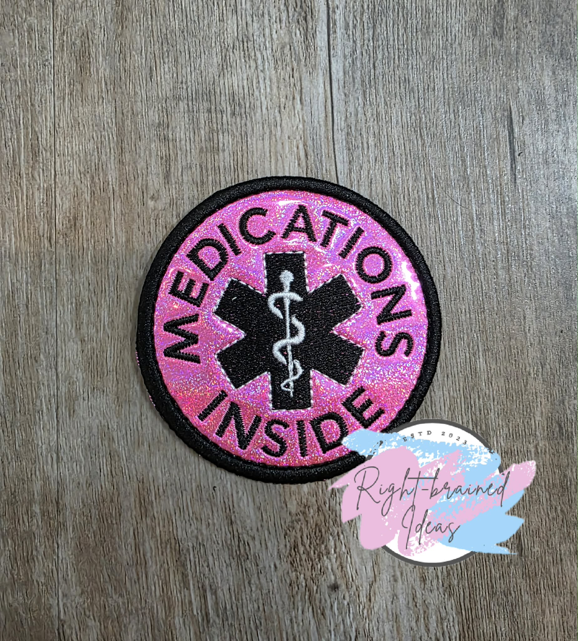(1) 3.5in sparkle pink holographic vinyl circular patch: "Medications Inside" in black curved around a medical symbol consisting of a white staff over a black star.