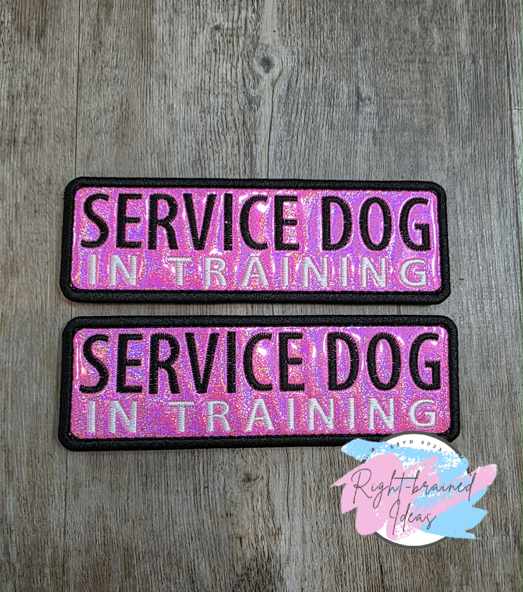 (2) 6in x 2in sparkle pink holographic vinyl rectangular patches: "Service Dog" in black and "In Training" in white.