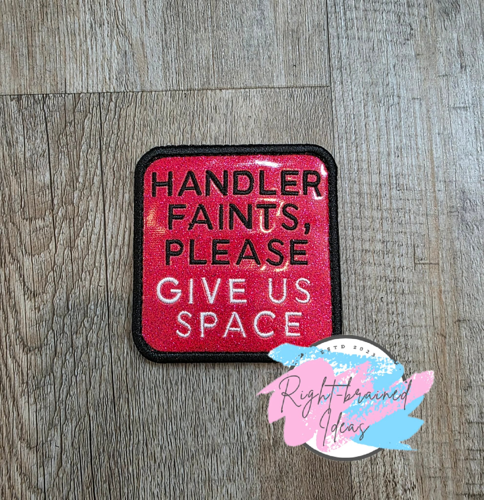 (1) 3.5in x 3in sparkle red vinyl rectangular patch: "Handler Faints, Please" in black thread and "Give Us Space" in white thread.