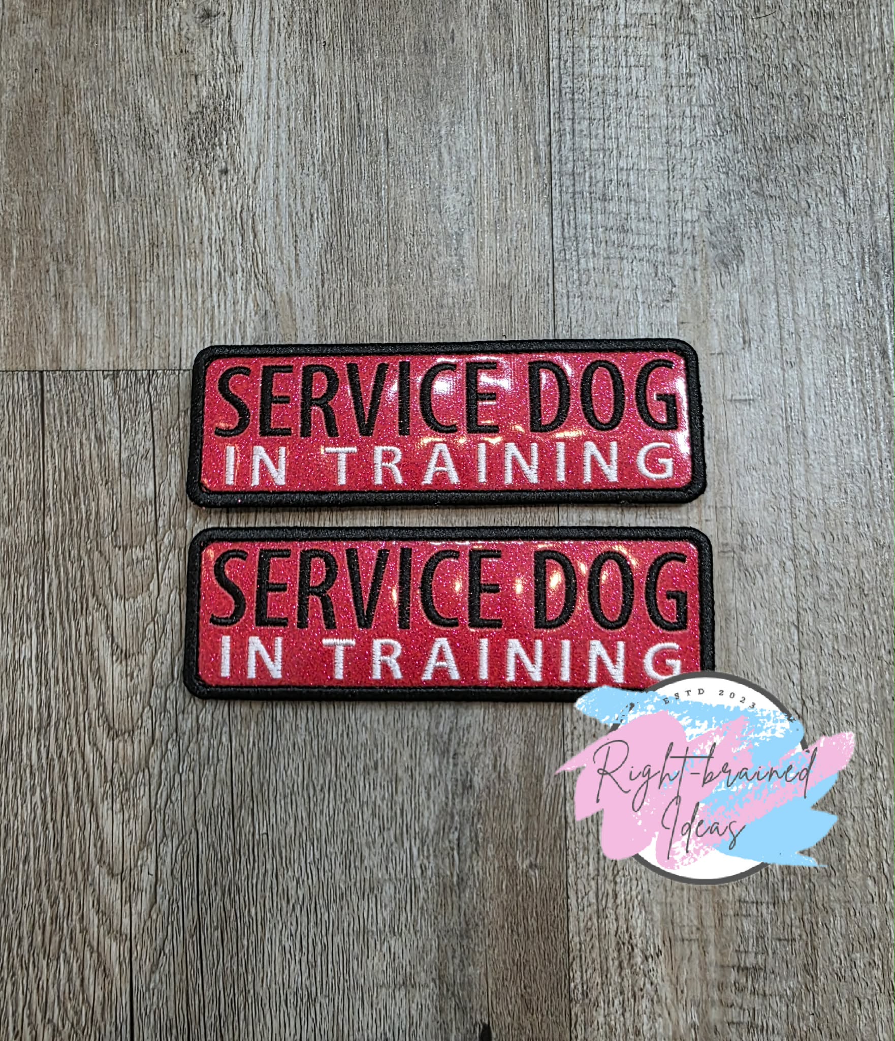 (2) 2in x 6in sparkle red vinyl rectangular patches: "Service Dog" in black. "In Training" in white.