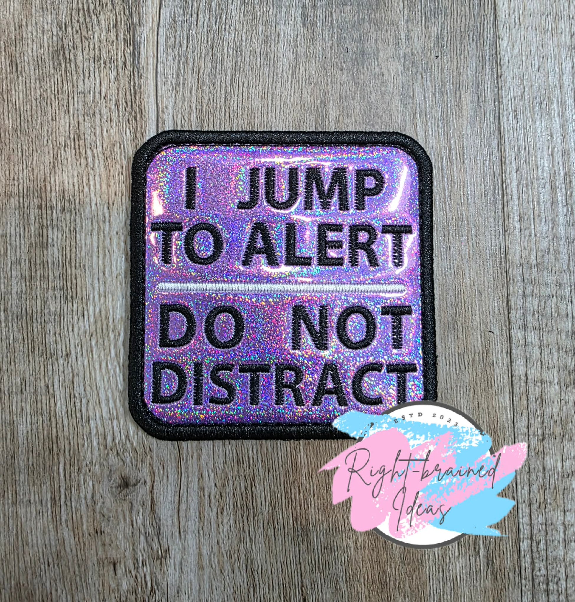 (1) 3.5in sparkle purple holographic vinyl rectangular patch: "I Jump To Alert" and "Do Not Distract" in black with a white line in between the two statements.