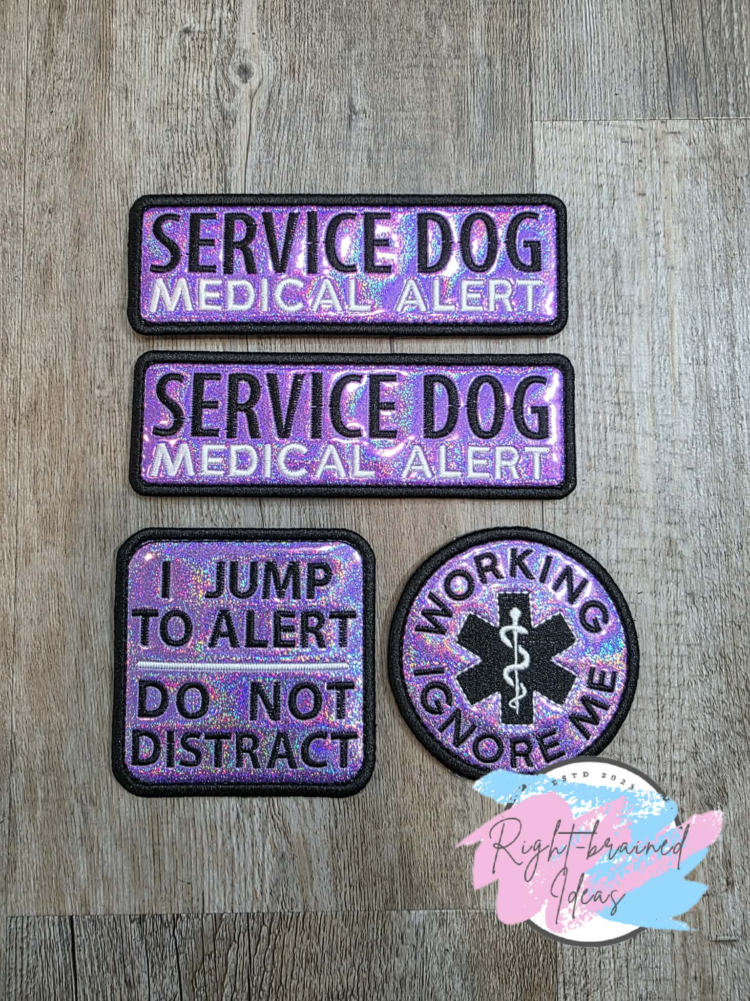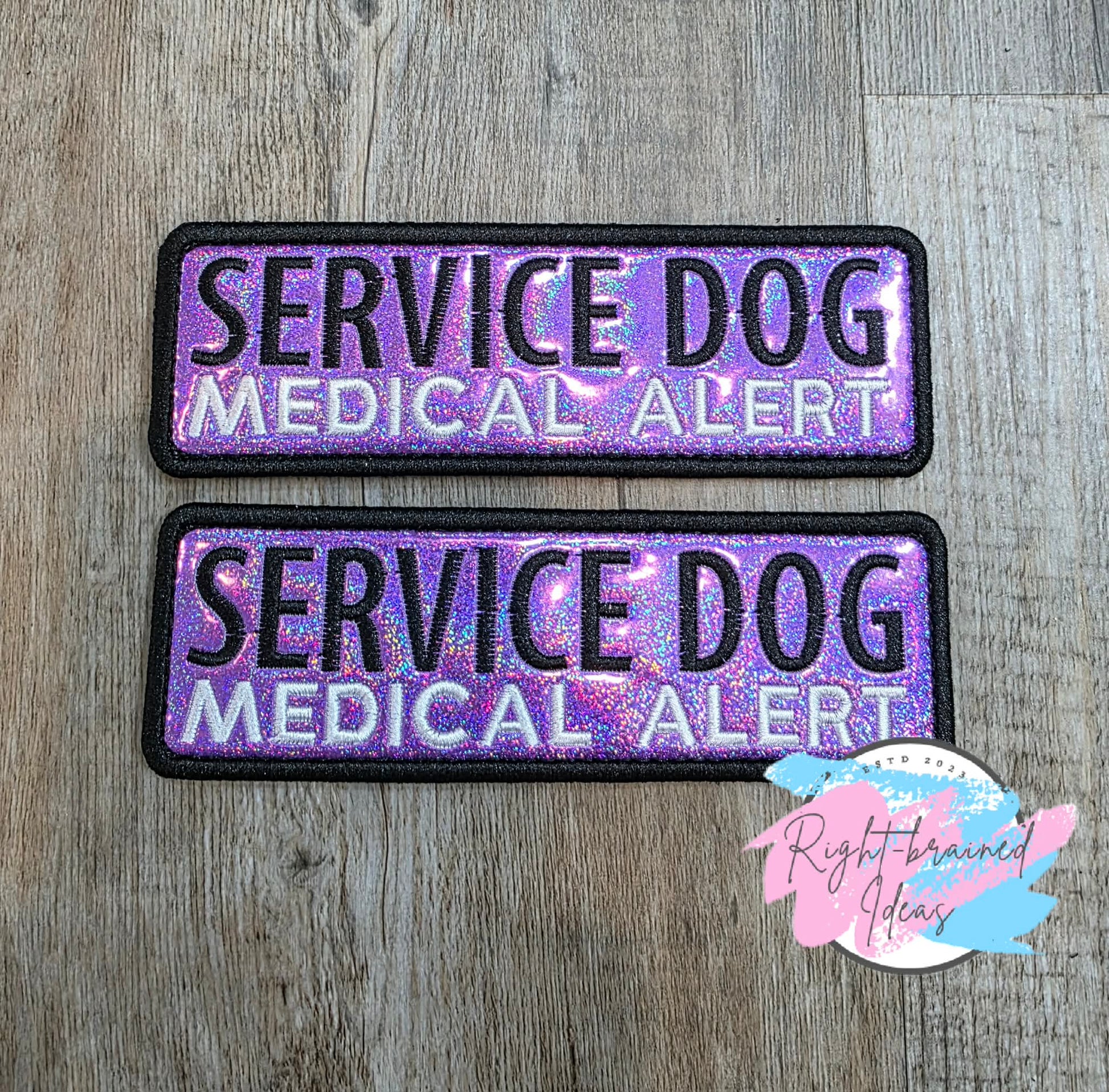 (2) 6in x 2in sparkle purple holographic vinyl rectangular patches: "Service Dog" in black and "Medical Alert" in white.