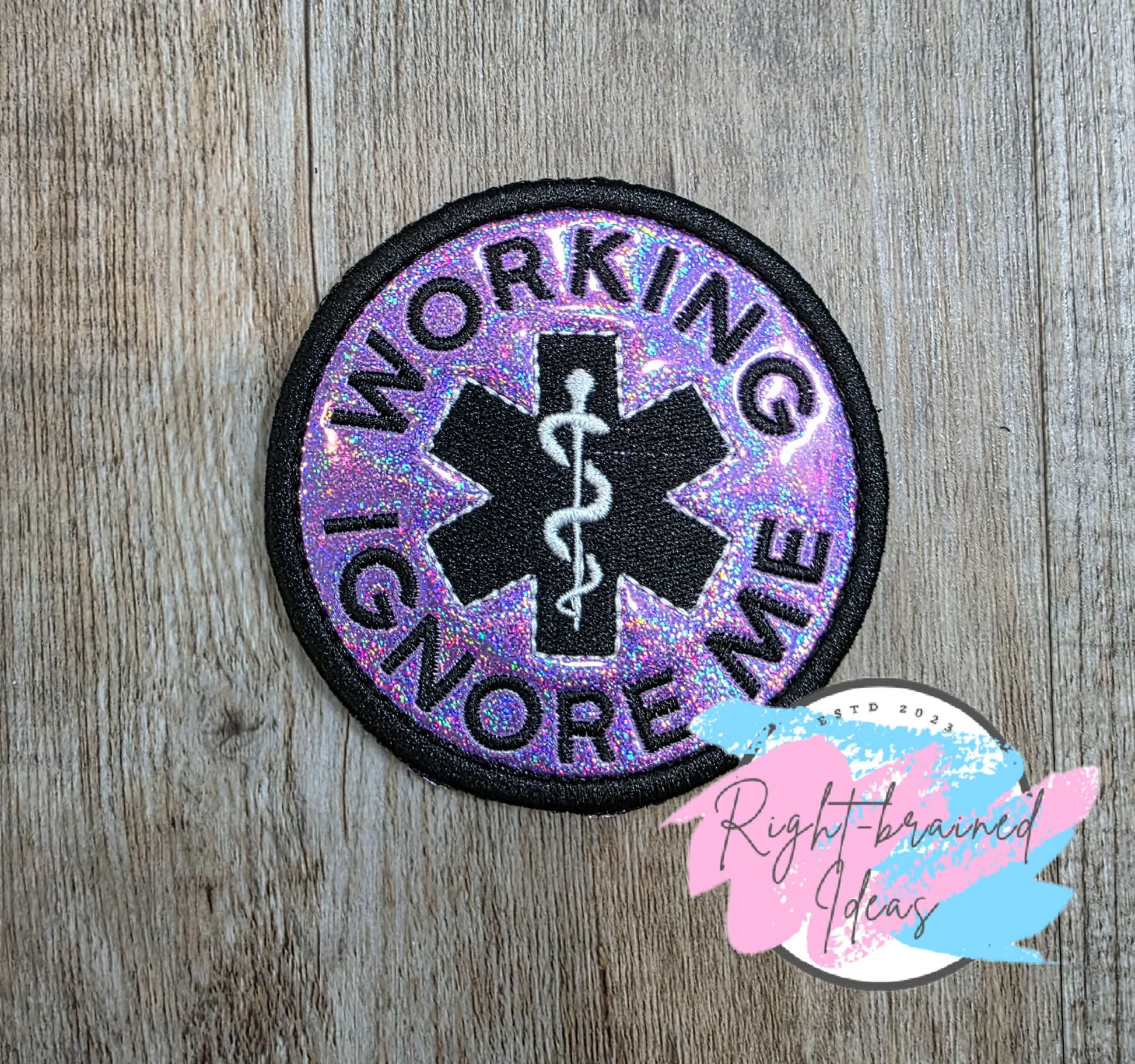 (1) 3.5in sparkle purple holographic vinyl circular patch: "Working Ignore Me" in black curved around a medical symbol consisting of a white staff over a black star.