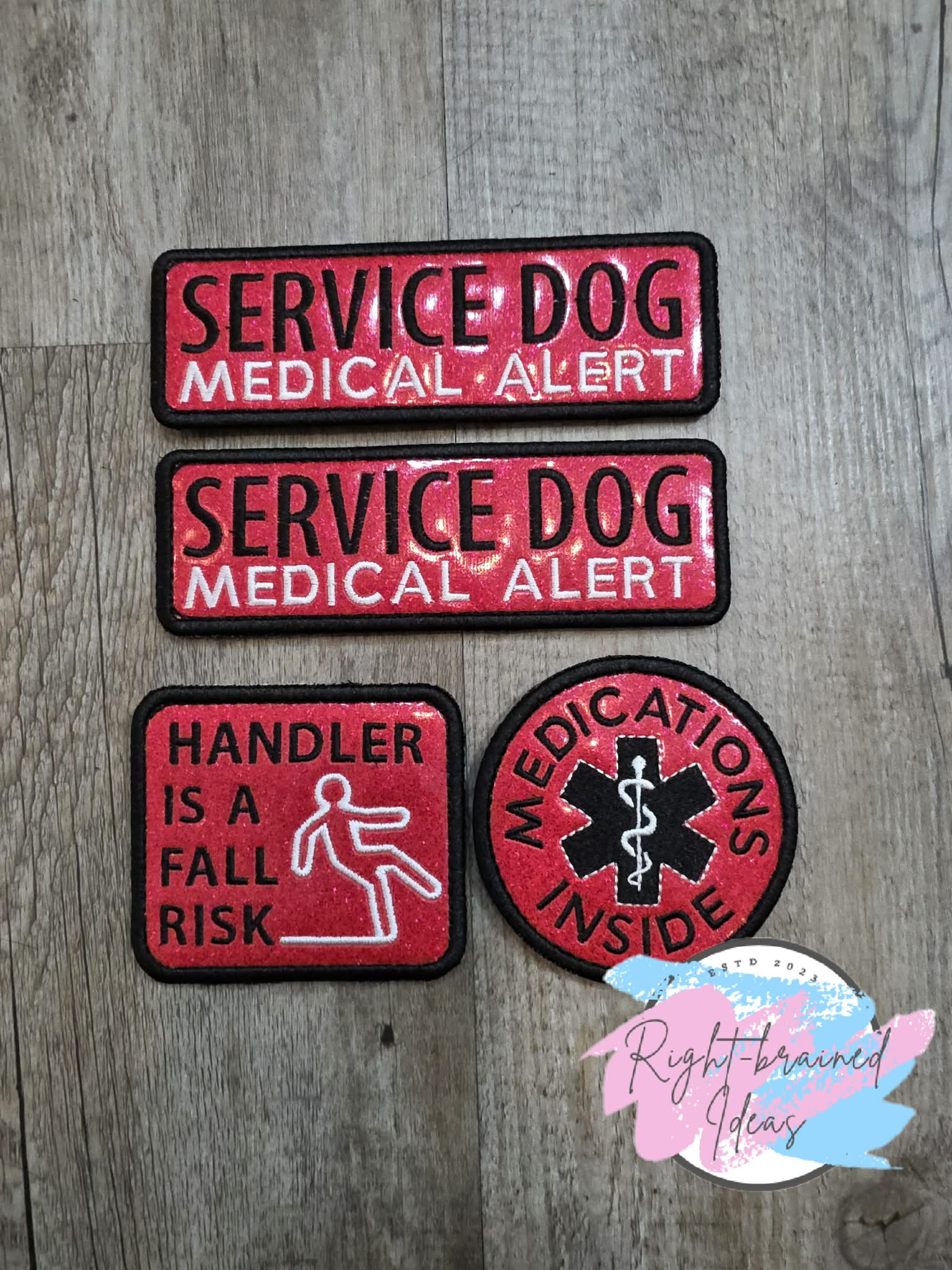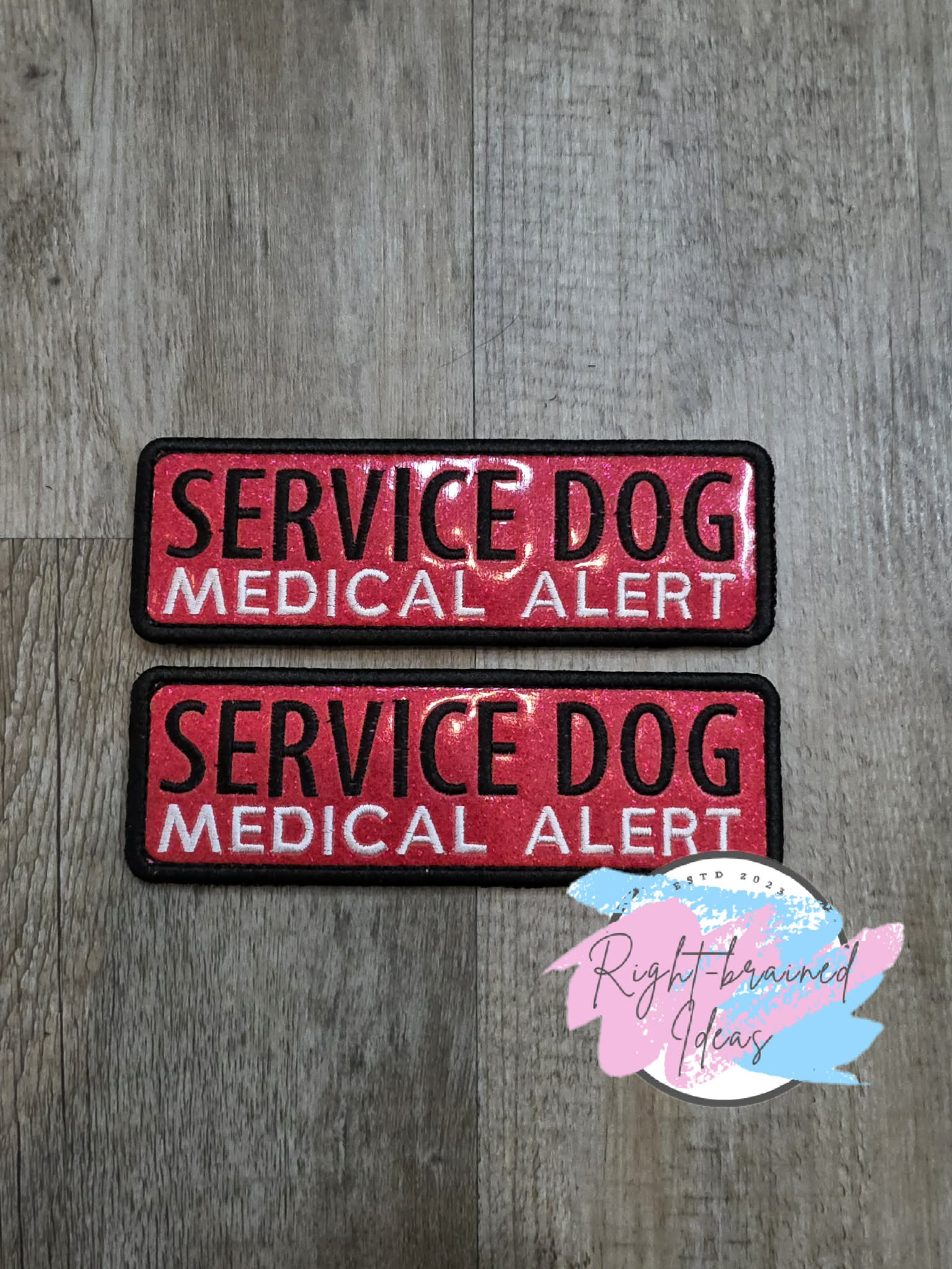 (2) 6in x 2in sparkle red vinyl rectangular patches: "Service Dog" in black. "Medical Alert" in white.