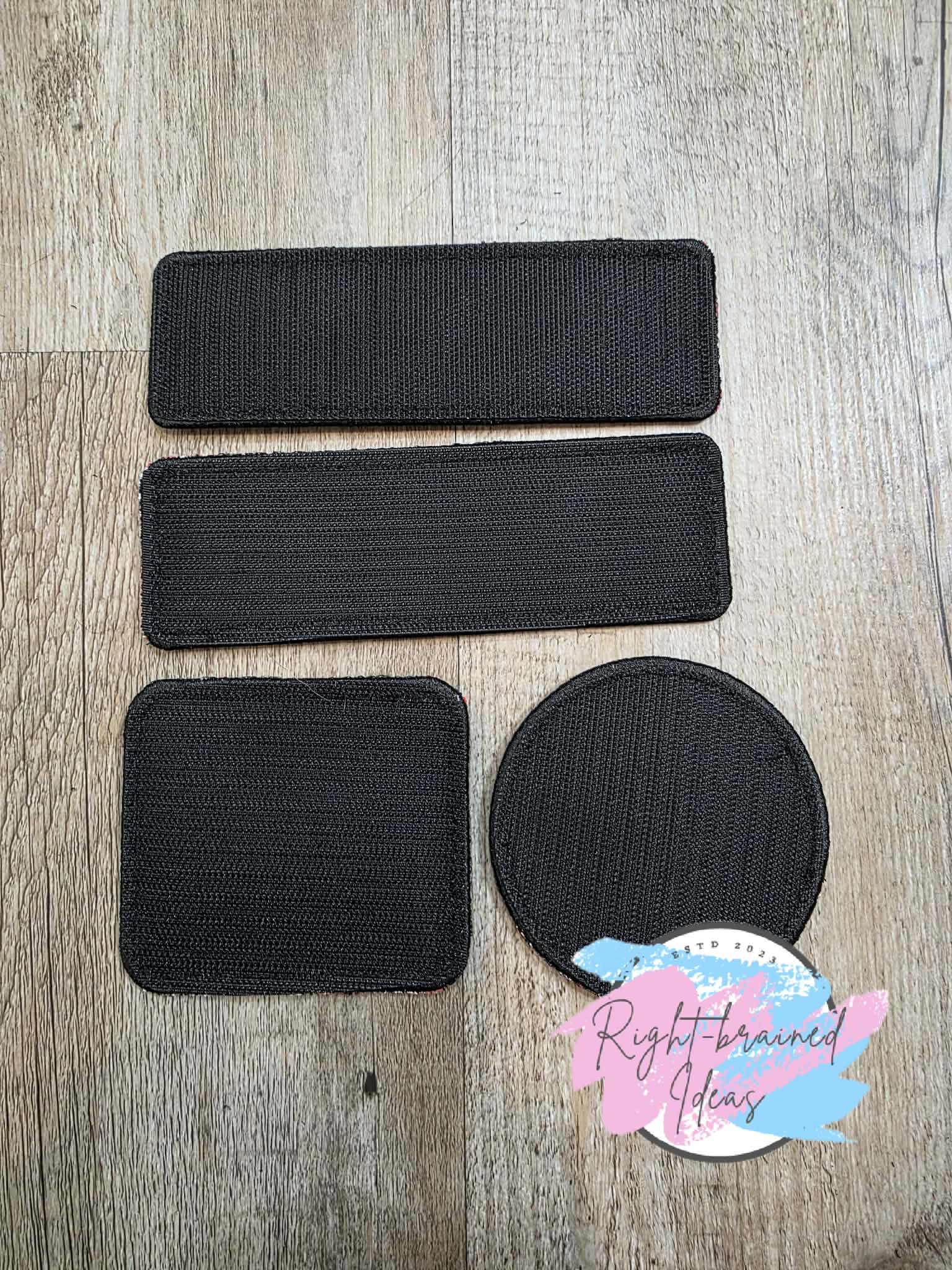 This is a four-piece patch set constructed of sparkle red vinyl with black and white embroidery thread. All patches have black satin borders and velcro sewn on the backside.