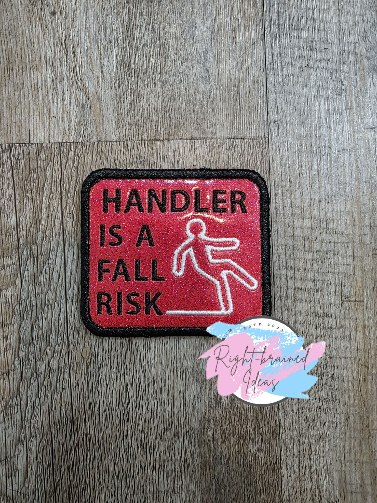 (1) 3in x 3.5in sparkle red vinyl rectangular patch: "Handler Is A Fall Risk" in black next to an outline of a falling human figure in white.