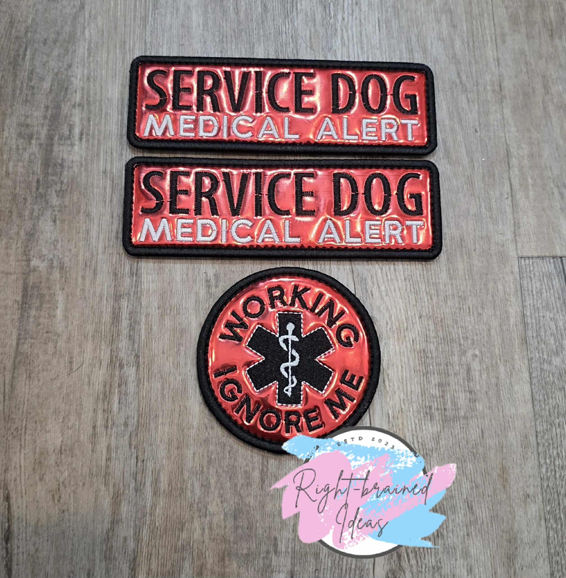 Service Dog Medical Alert Black And White on Metallic Red Vinyl Three-piece Patch Set