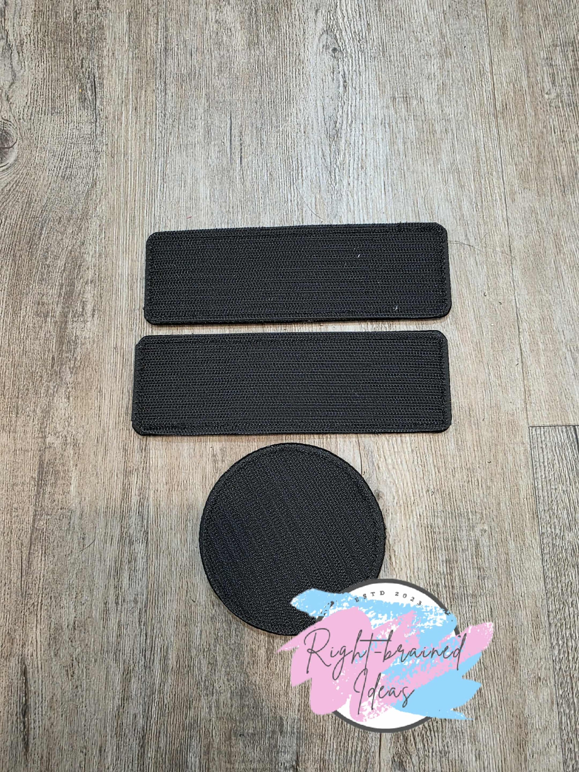 This is a three-piece patch set made with metallic red vinyl with white and red embroidery thread. All patches have velcro sewn on the backside and black satin borders.