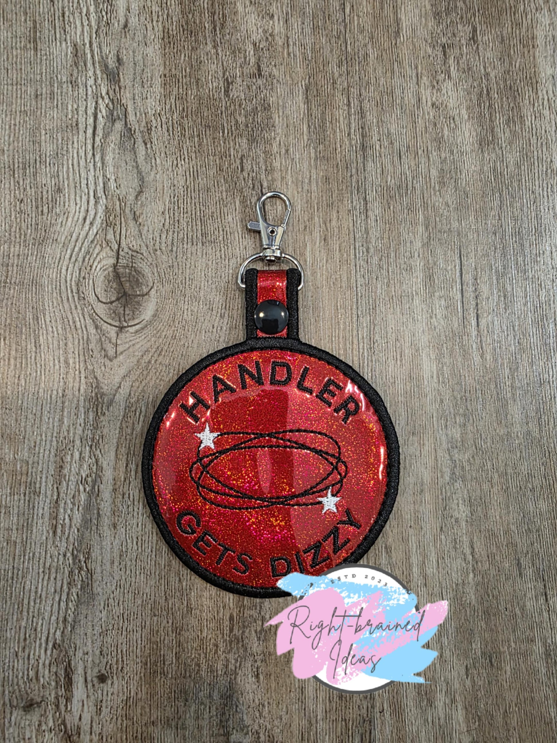 (1) 3.5in × 6in circular patch tab: "Handler Gets Dizzy" around a dizzy symbol.