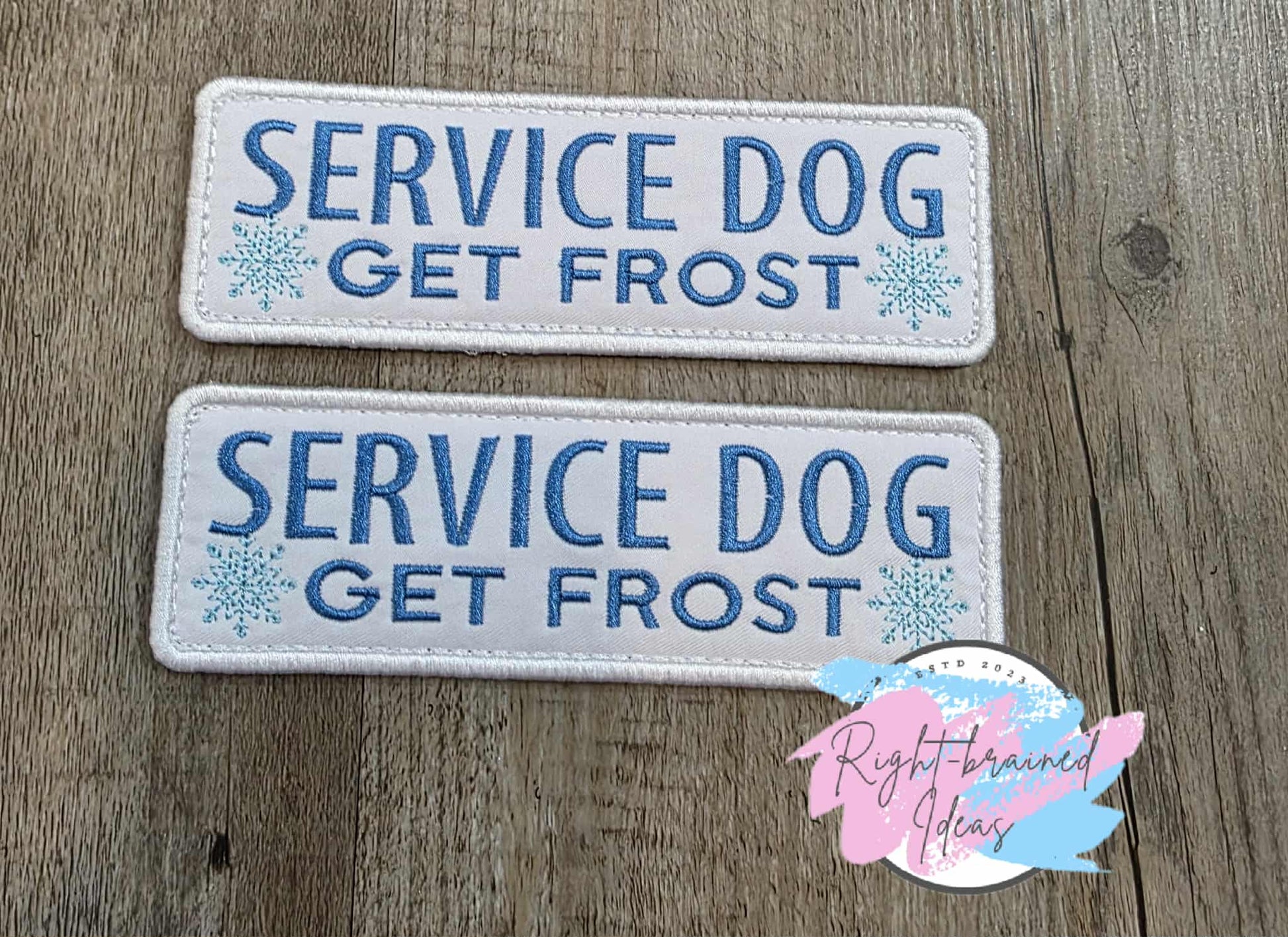 (2) 6in × 2in white twill rectangular patches: "Service Dog Get Frost" in Periwinkle. There are light blue snow flakes in the low corners of each patch.