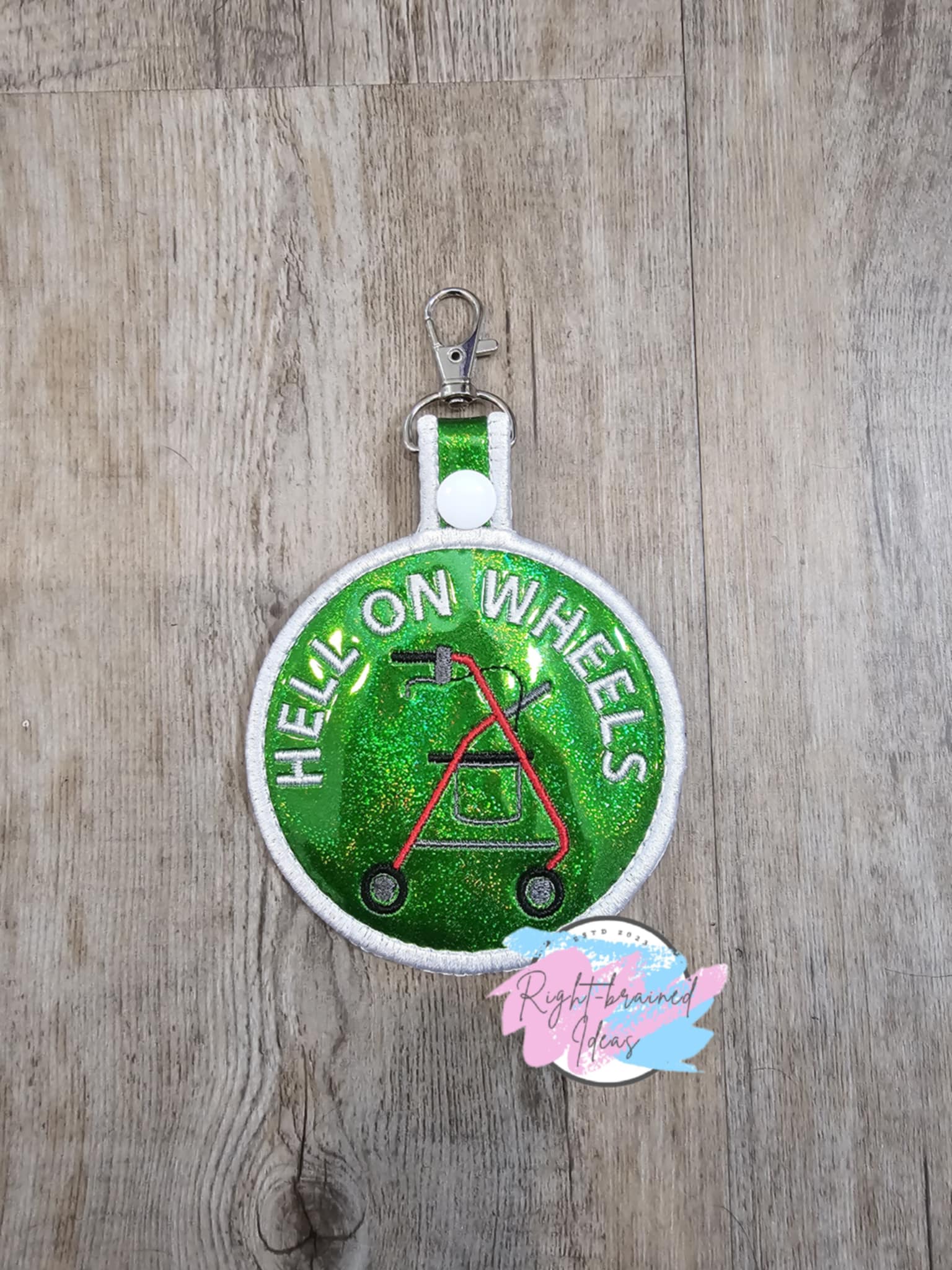(1) 3.5in x 6in circular patch tab: "Hell on Wheels" around a figure of a rollator