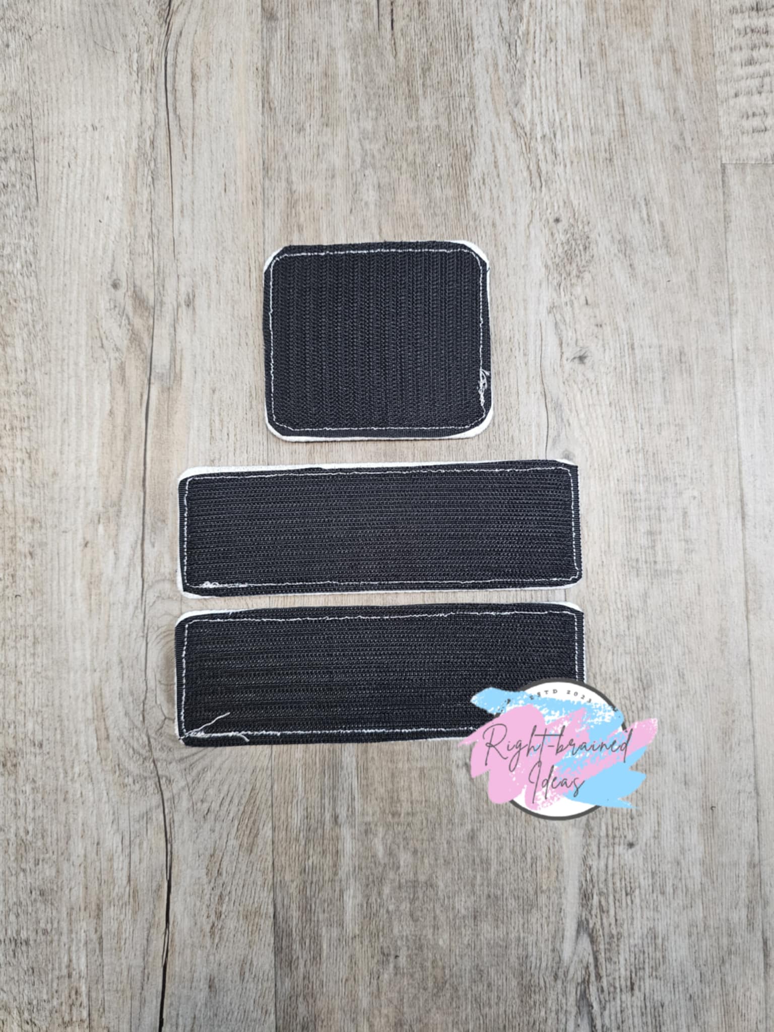 Basic four-piece set that has three patches and one patch tab. The set is made with holographic sparkle teal blue vinyl white, red and black embroidery thread and velcro on the backside of the patches. The patch tab has a white plastic snap that enclosed a metal d-ring clip.