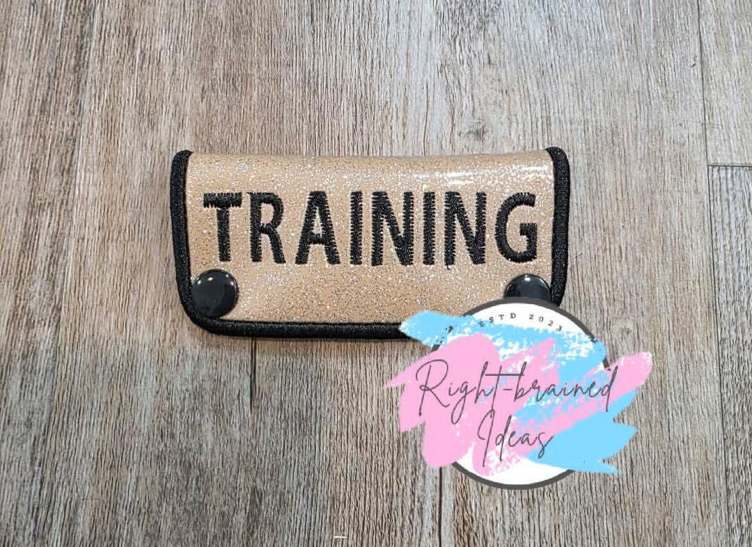 (1) 4in x 2in sparkle tan vinyl rectangular mini leash wrap: "Training" in black on both sides of the wrap.